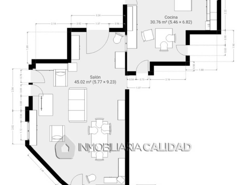 Amplio salón de 45 m², muy luminoso, con grandes ventanales y vistas despejadas sobre la ciudad, ideal para disfrutar del día a día y de reuniones familiares.