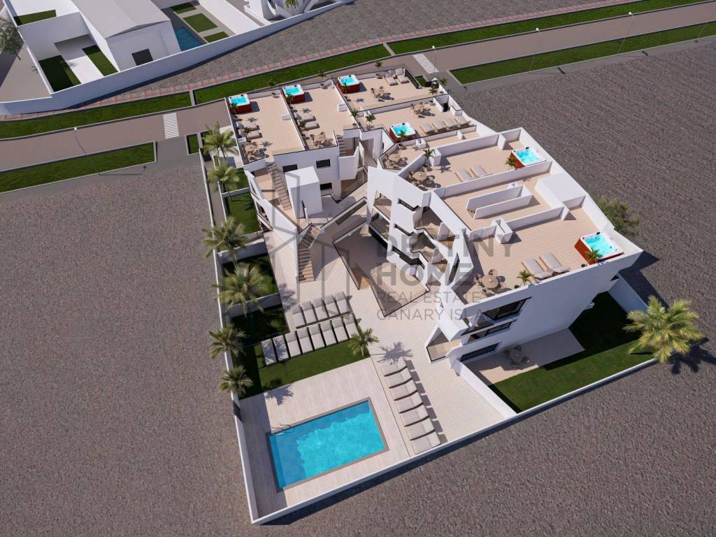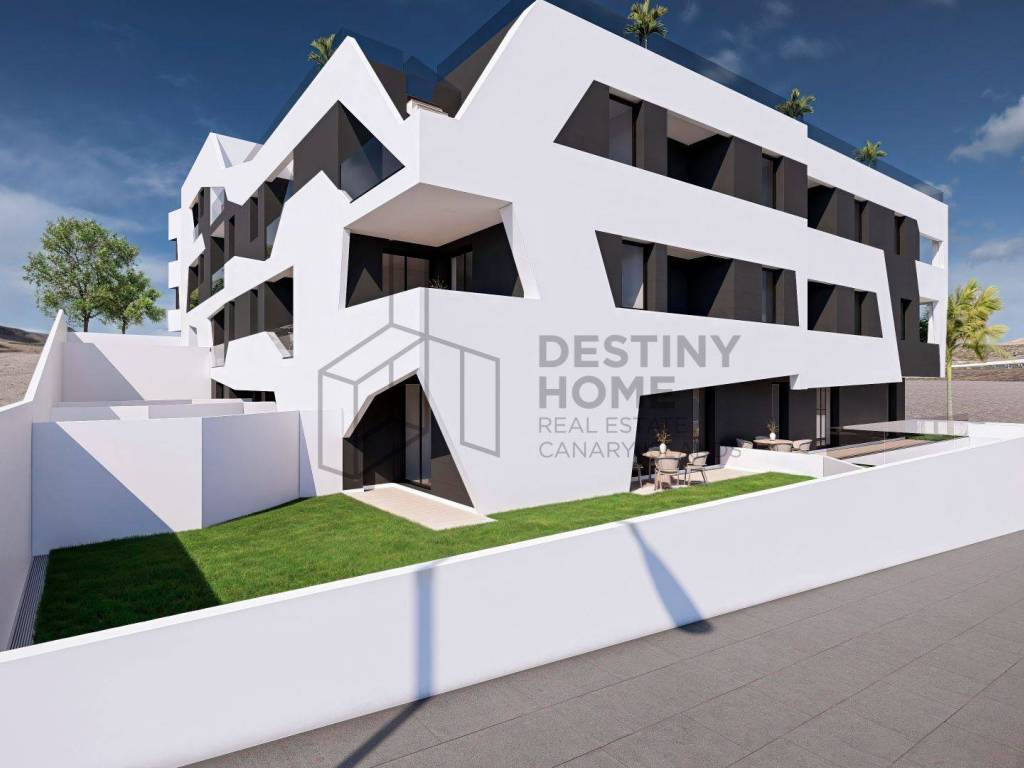 - Mixed facade: Premium Canarian aesthetic with ventilated volcanic stone and white plaster.