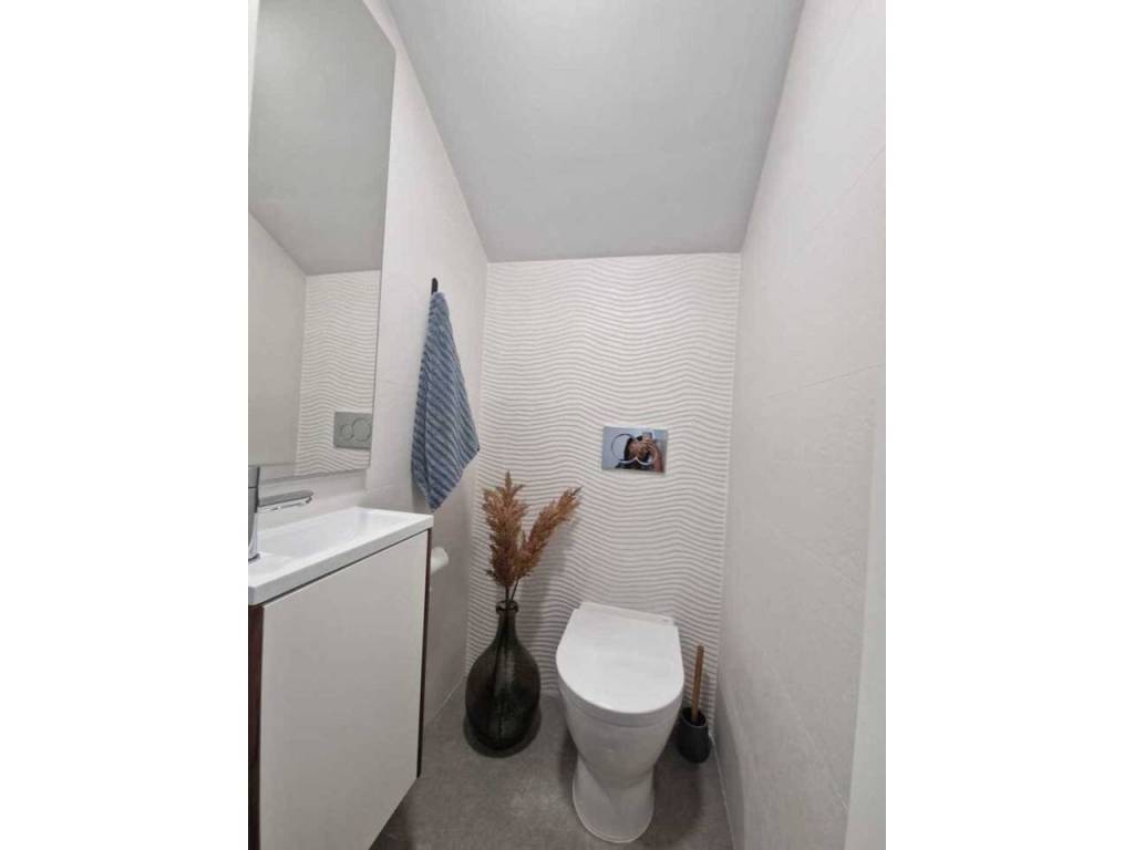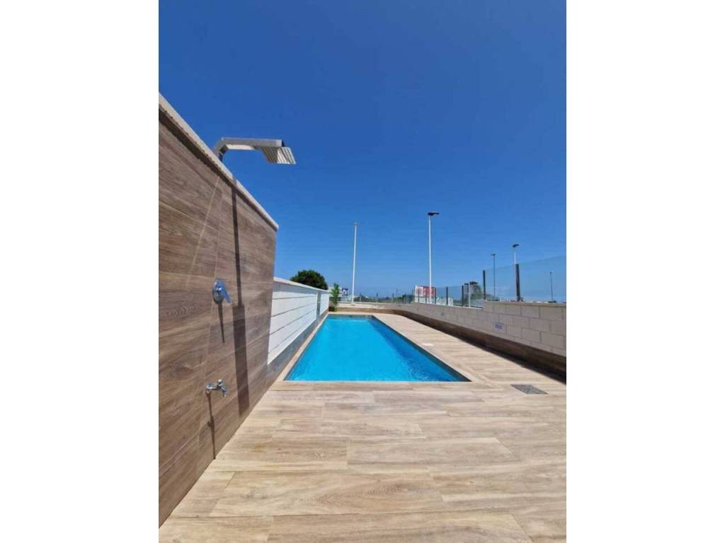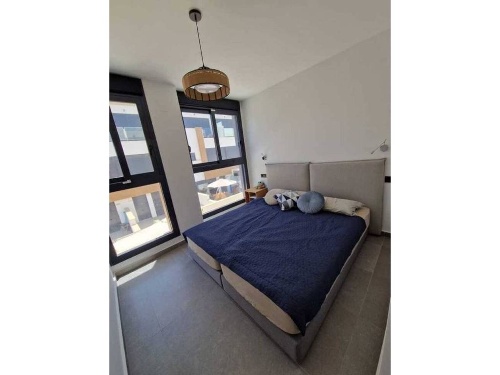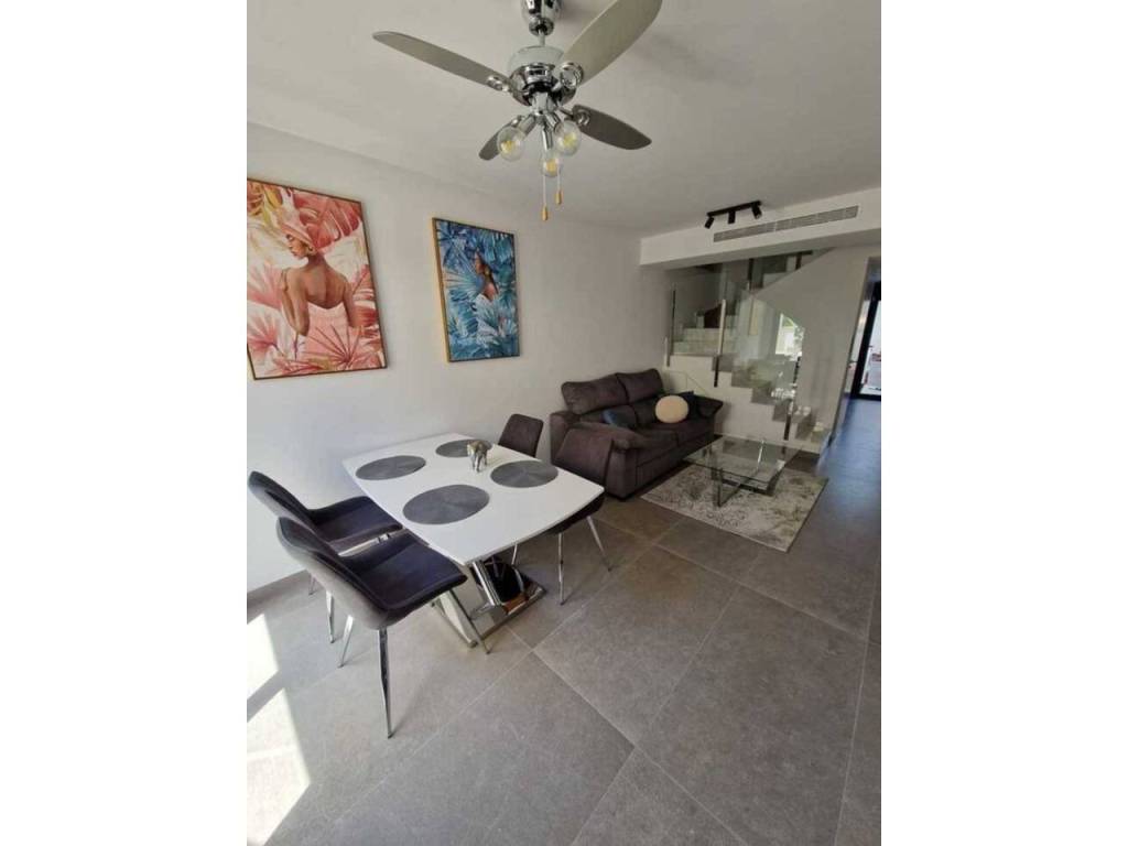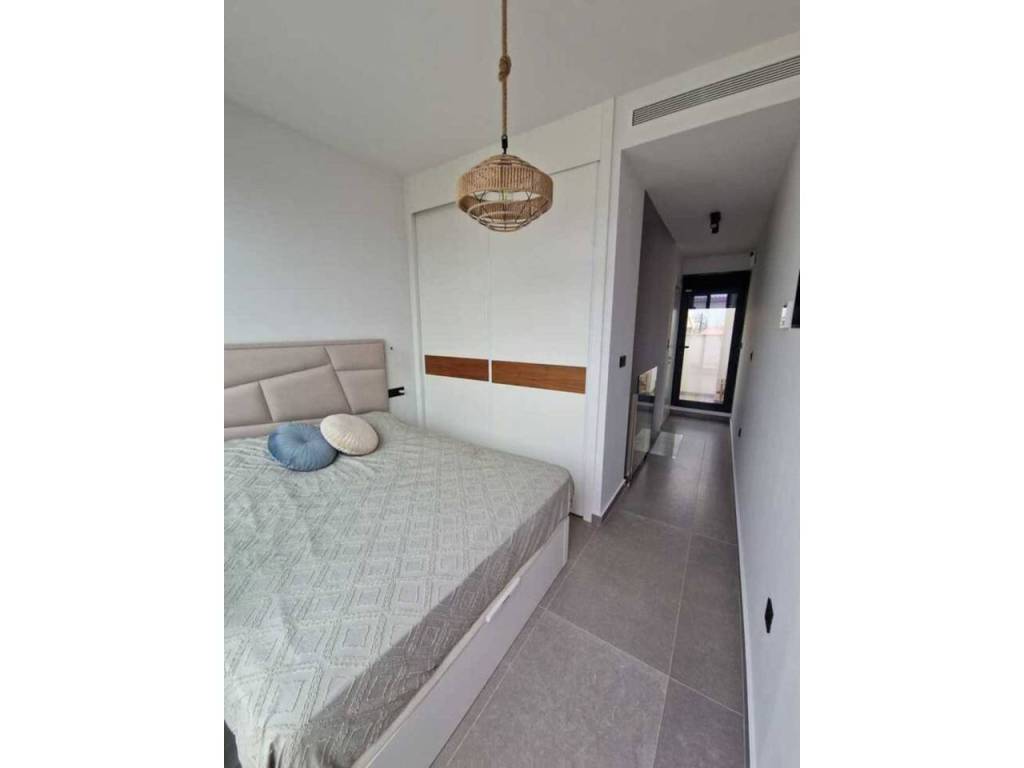 We offer for sale a beautiful, modern terraced house with an area of approximately 170 m², built in 2022, located in the prestigious Guardamar Hills area of Guardamar del Segura.The property is located in a new, gated community with a swimming pool, exclusively for residents' use. It offers the perfect combination of proximity to the sea, comfort, and privacy – even during the summer season.LocationThe house is located just 700 meters from one of the most beautiful beaches on the Costa Blanca – approximately a 10-minute walk or 3-minute drive.The area offers shops, restaurants, an aromatic park, a palm-lined promenade, and numerous walking areas.The property is fully furnished and equipped, decorated in a modern style with attention to detail. Bright colors dominate: white, gray, silver, and marble. The entire house is air-conditioned.Layout and StandardThe house was designed with comfort and functionality in mind, with its space spread over three levels and a private rooftop solarium.On the ground floor, there's a bright, spacious living room combined with a dining area, creating an ideal living area for relaxing and gathering with family or friends. Next to it is a separate, fully equipped kitchen and a powder room. The living room opens onto an elegantly landscaped front terrace with greenery and a lounge area. An additional advantage is the rear terrace, equipped with a shower, washing machine, and electric water heater—perfect for returning from the beach.The first floor features two comfortable bedrooms with spacious built-in wardrobes and a modern bathroom with a shower.The second floor is the owner's private area—a bedroom with a built-in wardrobe, an elegant bathroom with a shower, and a private terrace, perfect for morning coffee or a moment of relaxation.This level opens onto a private rooftop solarium, which offers stunning views of the sea and mountains. It's a unique space for sunbathing, evening gatherings, and relaxation year-round.The property offers three bedrooms, two bathrooms, and an additional toilet, as well as two terraces and a rooftop solarium. The owners also have access to two parking spaces in the underground garage and a swimming pool within the gated community. The entire property is a new, high-standard development in a prime location—just minutes from the beach.Why is it worth it?This is an ideal property for both personal use and rental purposes. Ready to move in immediately—no additional investment required.