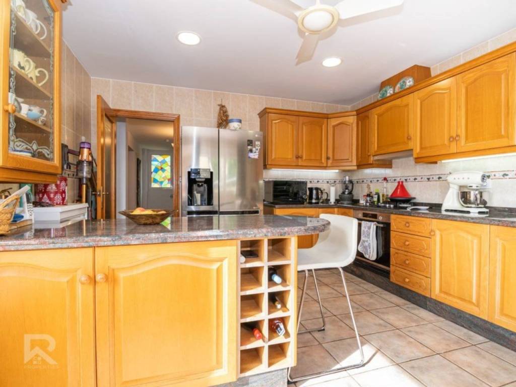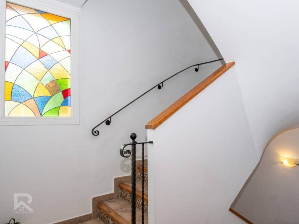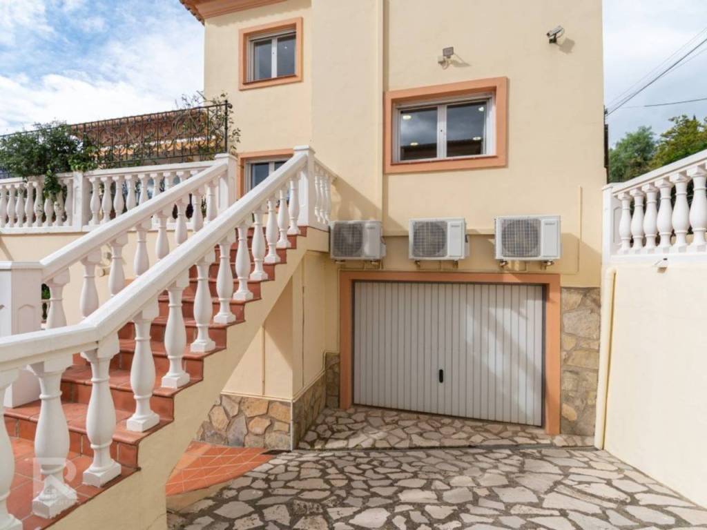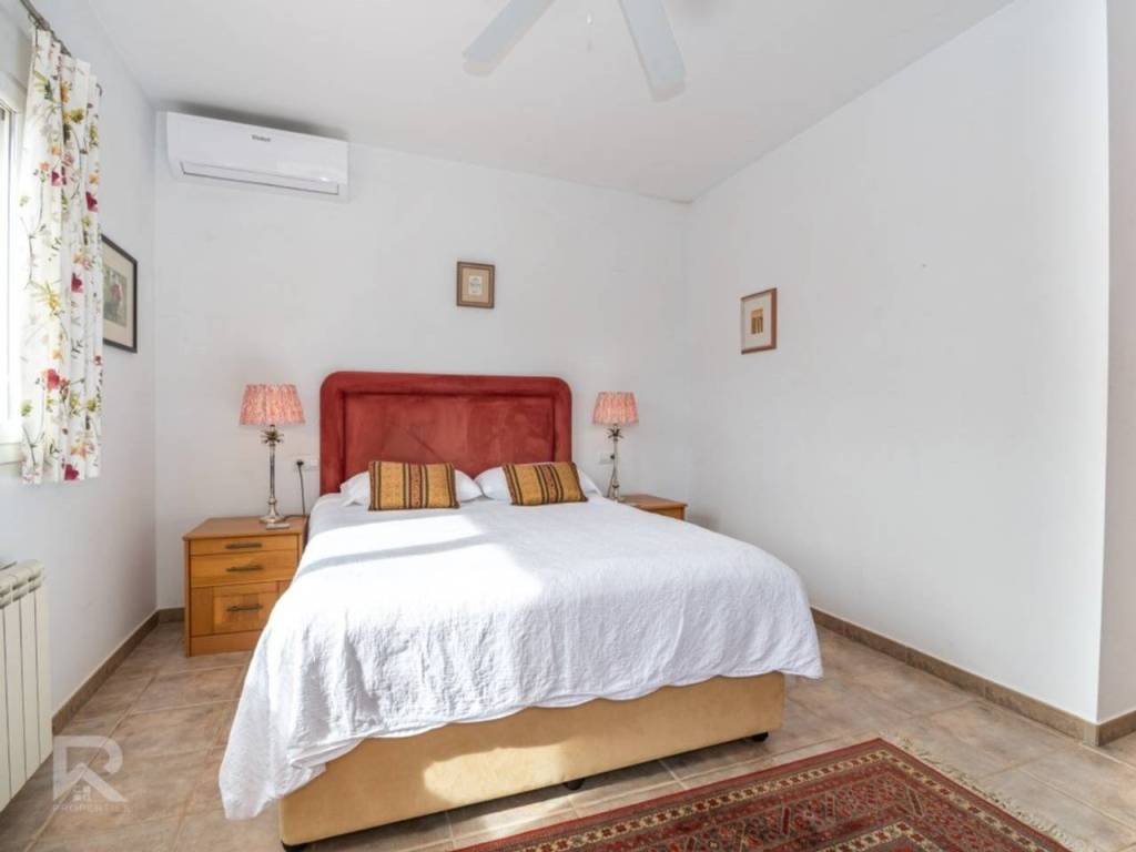 Among its many features: central heating with radiators, air conditioning units, ceiling fans in every bedroom, built-in wardrobes, PVC windows with double glazing, alarm system, security cameras, automatic irrigation, solar panels, and a maintenance area with water softener and pool system. The property is fully connected to the public lighting and sewage network, ensuring modern convenience.