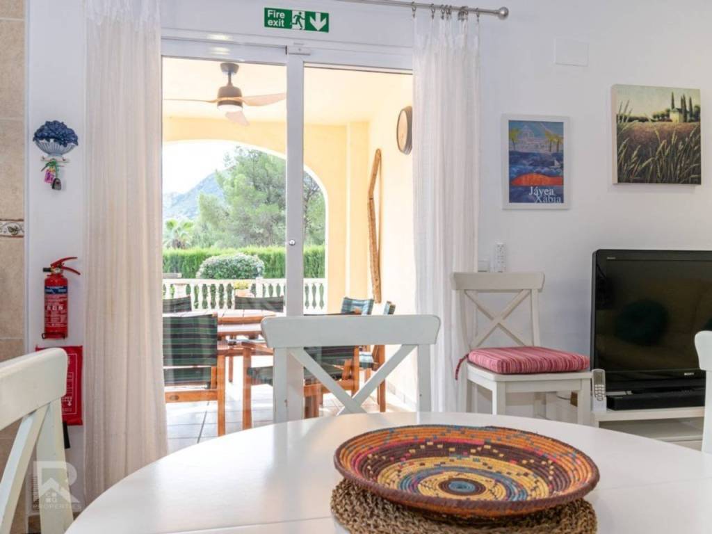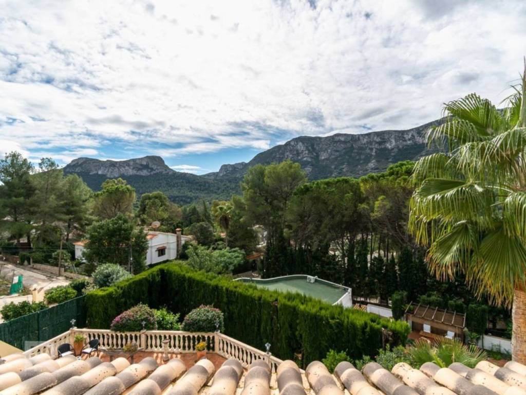 From the entrance hall, you step into a bright and welcoming living room opening onto a glazed terrace with stunning mountain views, a separate dining room perfect for gatherings, a guest bathroom, and a fully equipped kitchen with direct access to the pool and garden via an exterior staircase.