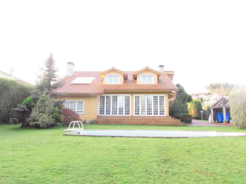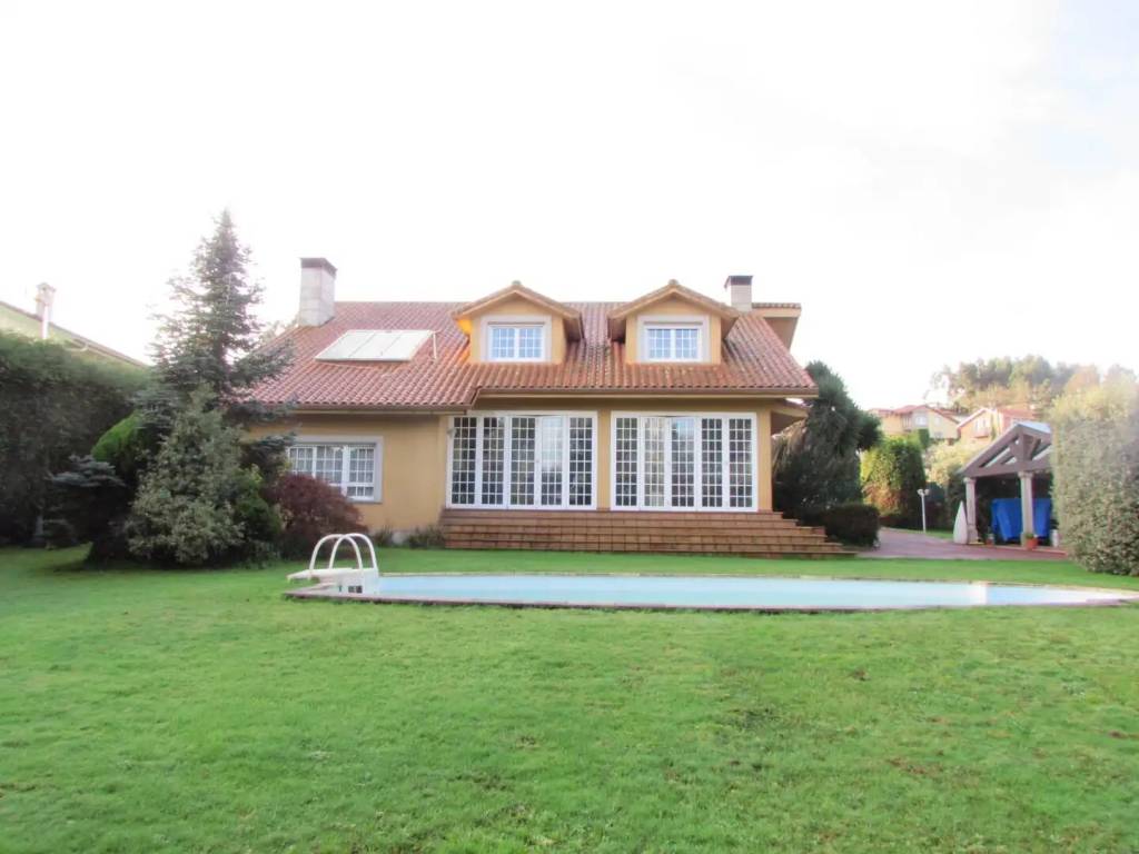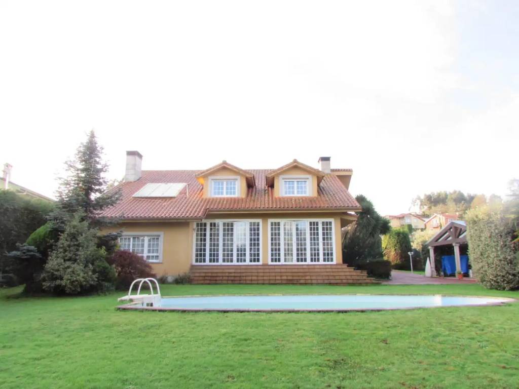 VENTA. Si quieres una casa cómoda y amplia, muy luminosa y soleada, con jardín y piscina, a 15 minutos de cualquier sitio, ven a ver esta propiedad. Se vende esta amplia vivienda en perfecto estado, en Carballas-Pravio-Cambre. La casa tiene amplios espacios, grandes ventanales, y una ubicación inmejorable. Se compone de: Planta baja de 220 metros cuadrados, a la que se accede por la entrada principal (en fachada delantera de la casa), por la fachada de atrás ( a través de su terraza), y por puerta exterior en la cocina; en donde encontraremos, -amplio recibidor, -un gran espacio distribuído en tres ambientes, uno como comedor, otro como salón con chimenea, y otro como biblioteca, -cocina grande, con salida al jardín, -baño completo, -cuarto lavadero, -porche-terraza, desde la que vemos la piscina (la terraza puede ser abierta o cerrada, pues dispone de amplios ventanales plegables). -garaje con capacidad para dos coches. Primera planta, de 180 metros cuadrados, a la que podemos subir por dos distintas escaleras, donde tenemos -cuatro dormitorios espaciosos, con amplias ventanas y armarios empotrados espaciosos, -dos baños, uno de ellos dentro de la habitación principal, -despacho, Además la propiedad cuenta con piscina, y un bonito merendero. La vivienda cuenta con calefacción, ventanas con doble cristal, y elementos aislantes. Suelos en baldosa y madera de alta calidad. La finca, llana, soleada y cerrada con muros altos, mide 2000 metros cuadrados. SEGREGABLE EN DOS FINCAS, para poder hacer una segunda casa. CONCIERTA UNA VISITA PARA VERLA, TE VA A CONVENCER.