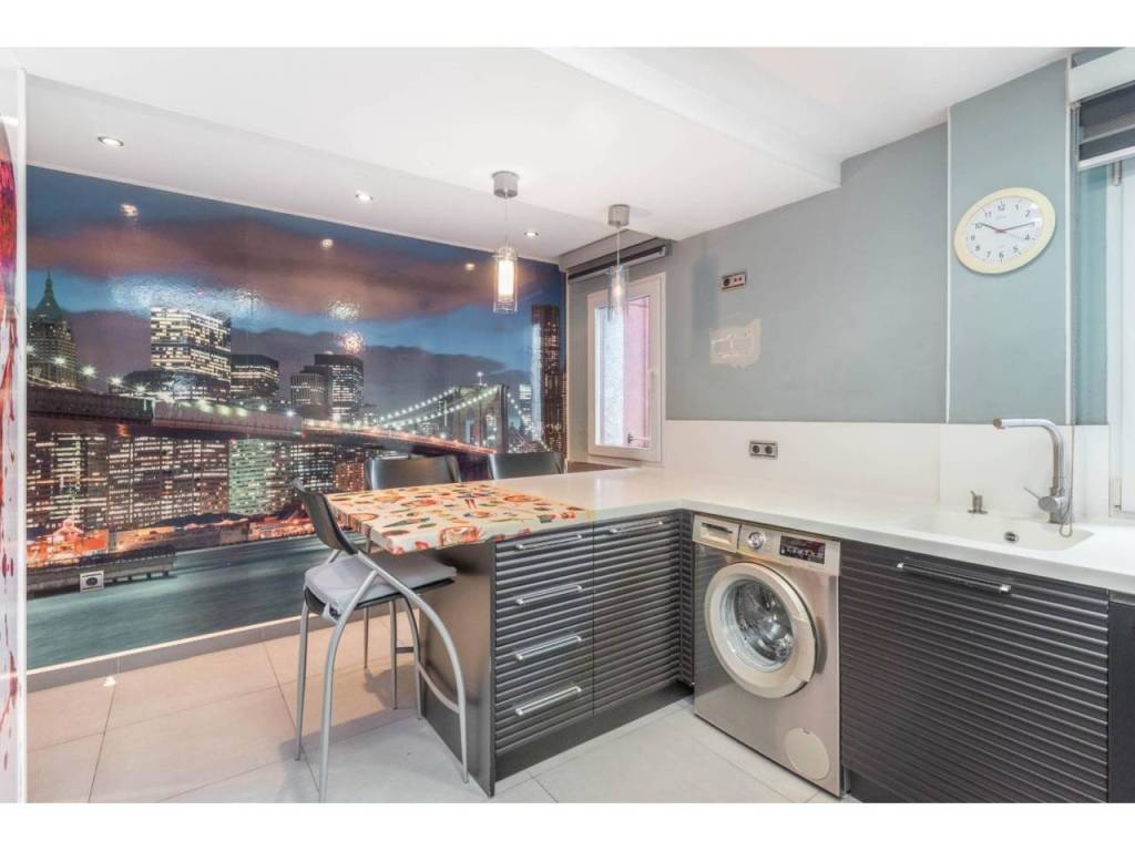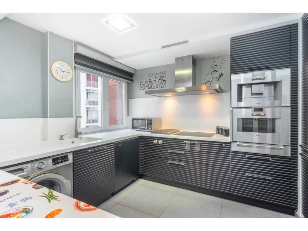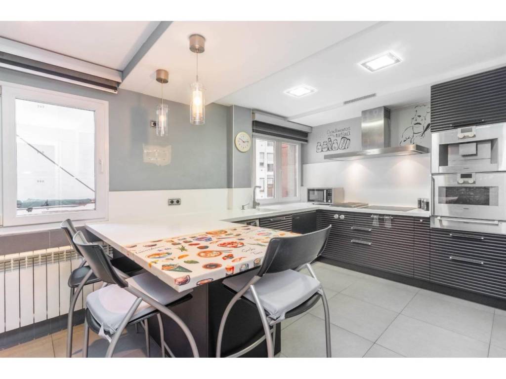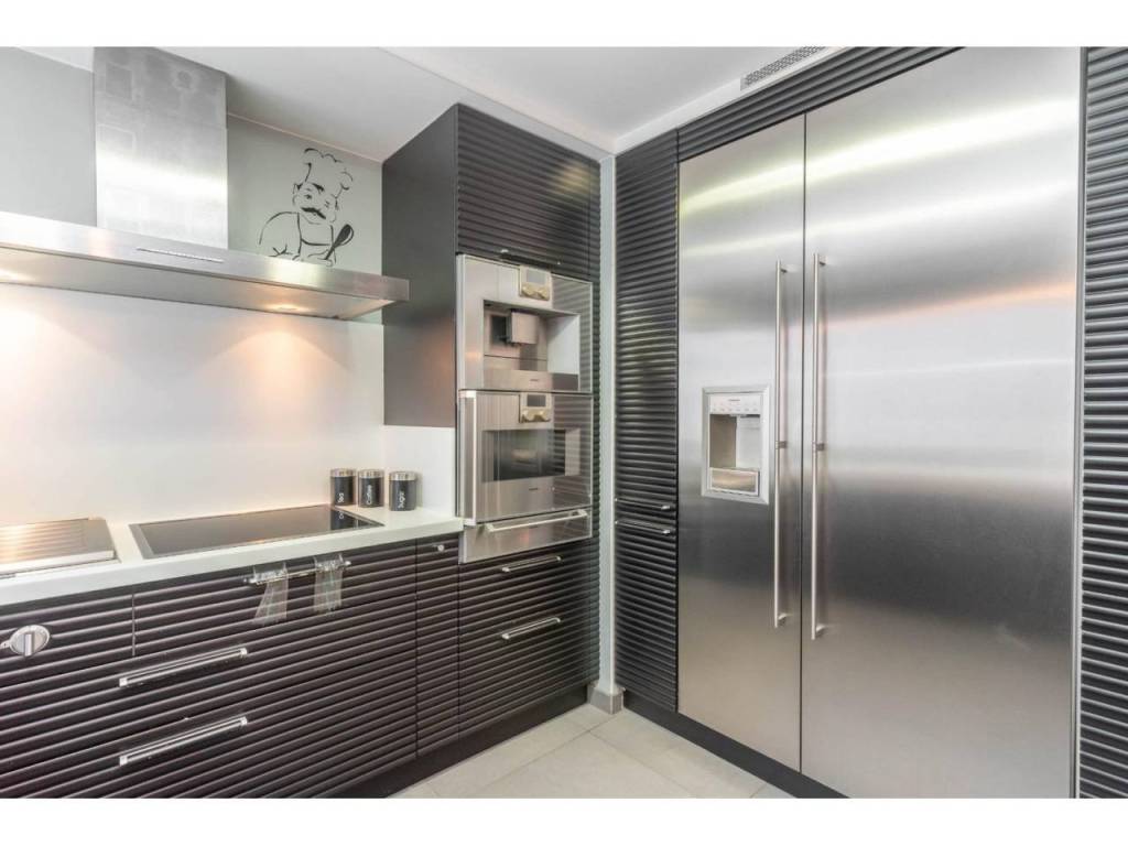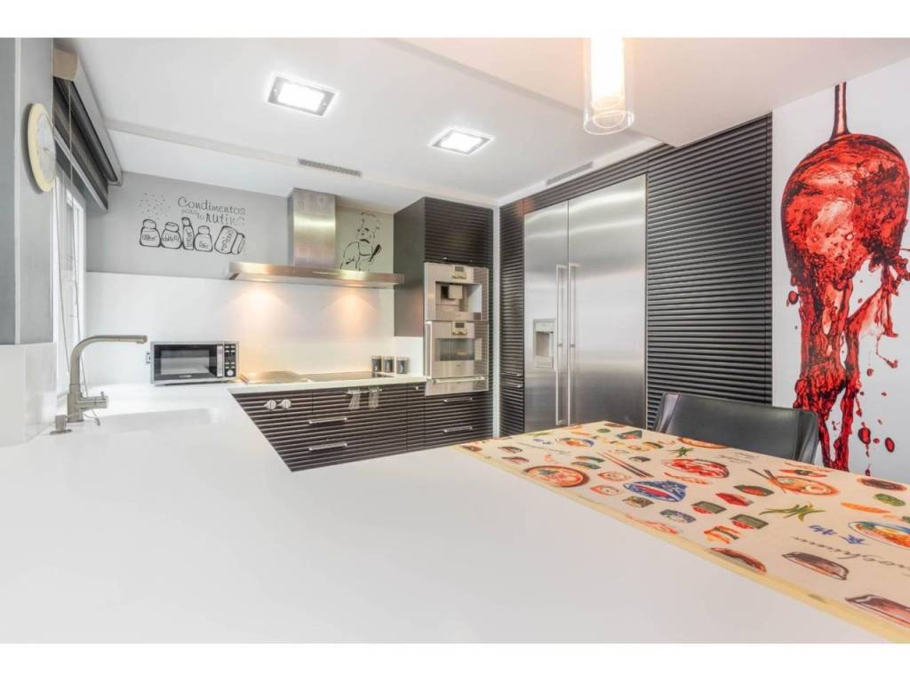 - Junto a él, y frente a la entrada, la cocina, muy amplia (16,7 m2) y moderna. Armarios y península con mucho almacenamiento. Encimera de corian. Electrodomésticos de primeras marcas: Microondas Black & Decker, Vitro, calientaplatos, plancha, cafetera y nevera Gaggenau y campana Guttman.