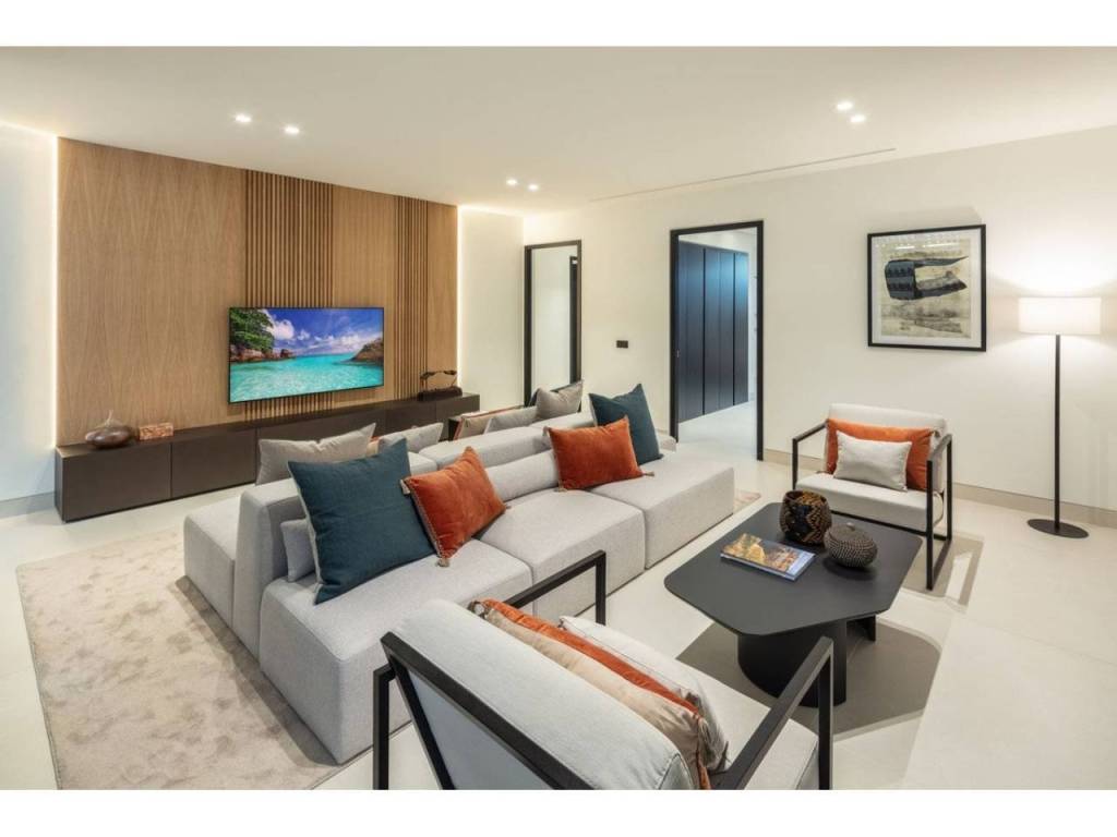 The heart of the home features an open-plan design where a luminous living room and formal dining area transition into a modern, fully equipped kitchen outfitted with high-end appliances. For more casual gatherings, the outdoor terraces extend the living space significantly, offering a dedicated kitchenette, a dining area, and a unique sunken chill-out lounge designed for entertaining under the sun or stars. Accommodation includes five well-proportioned bedrooms and five bathrooms, highlighted by a luxurious master suite complete with a walk-in wardrobe and an en-suite bathroom finished to premium standards.