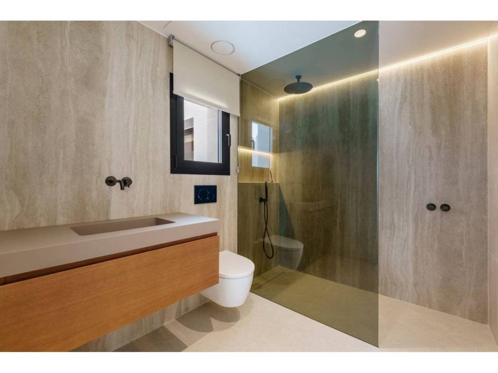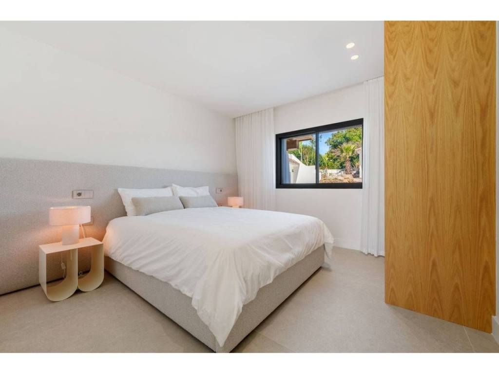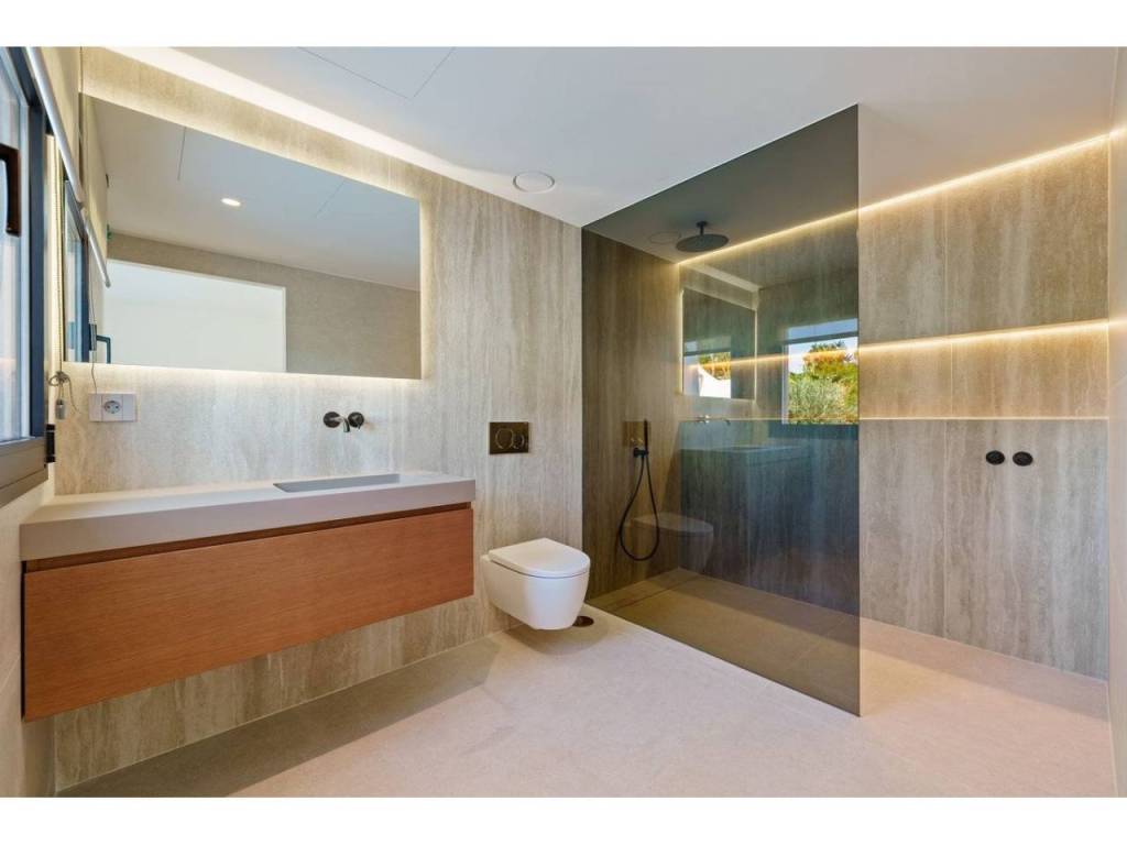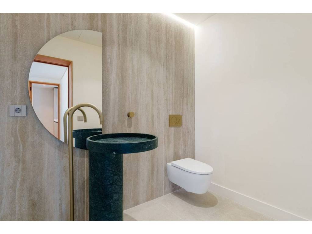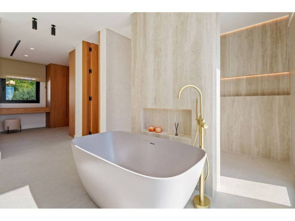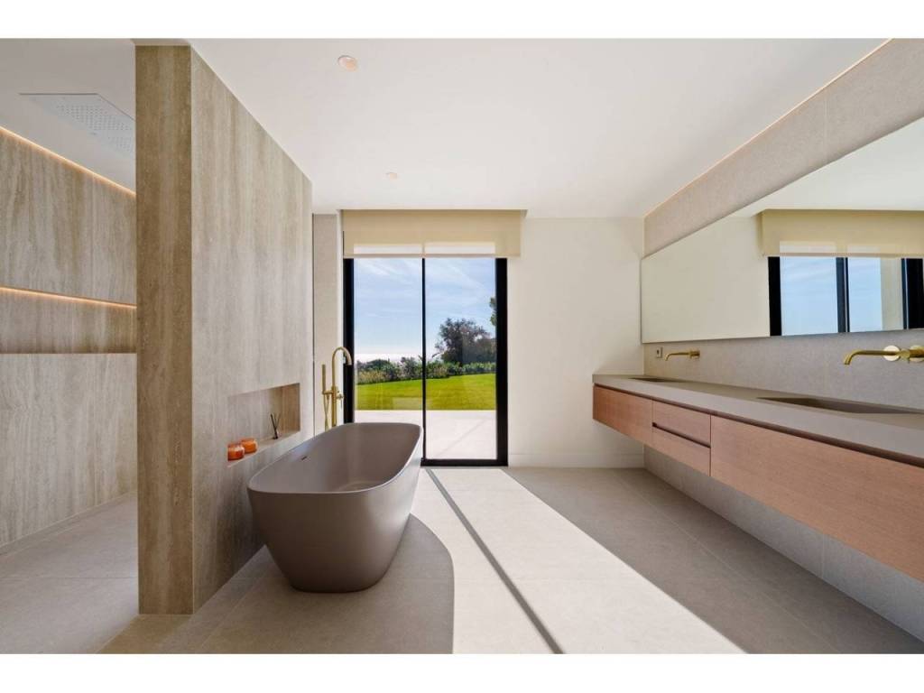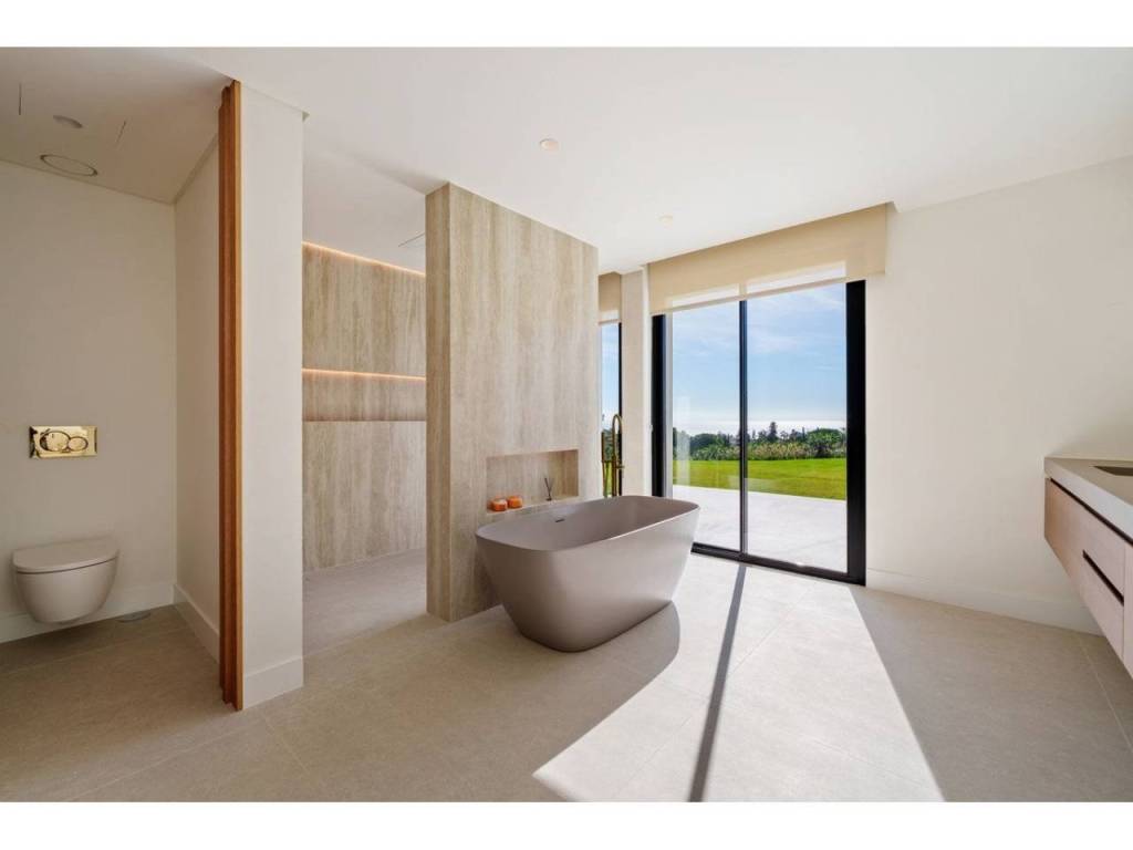 The master suite serves as a serene retreat with direct outdoor access and is complemented by a spa-inspired bathroom featuring a sculptural freestanding bathtub and warm textures. In total, the property offers five bedrooms and five bathrooms, each designed as a quiet retreat with pleasant views of the lush greenery or the sea.