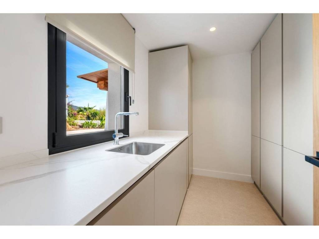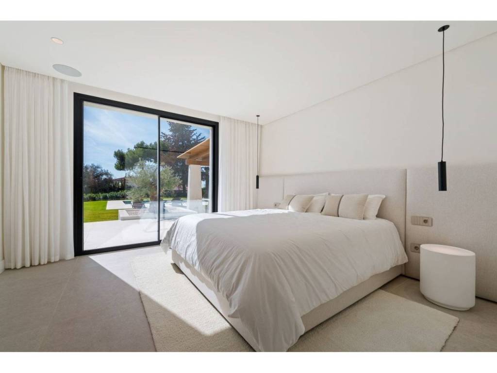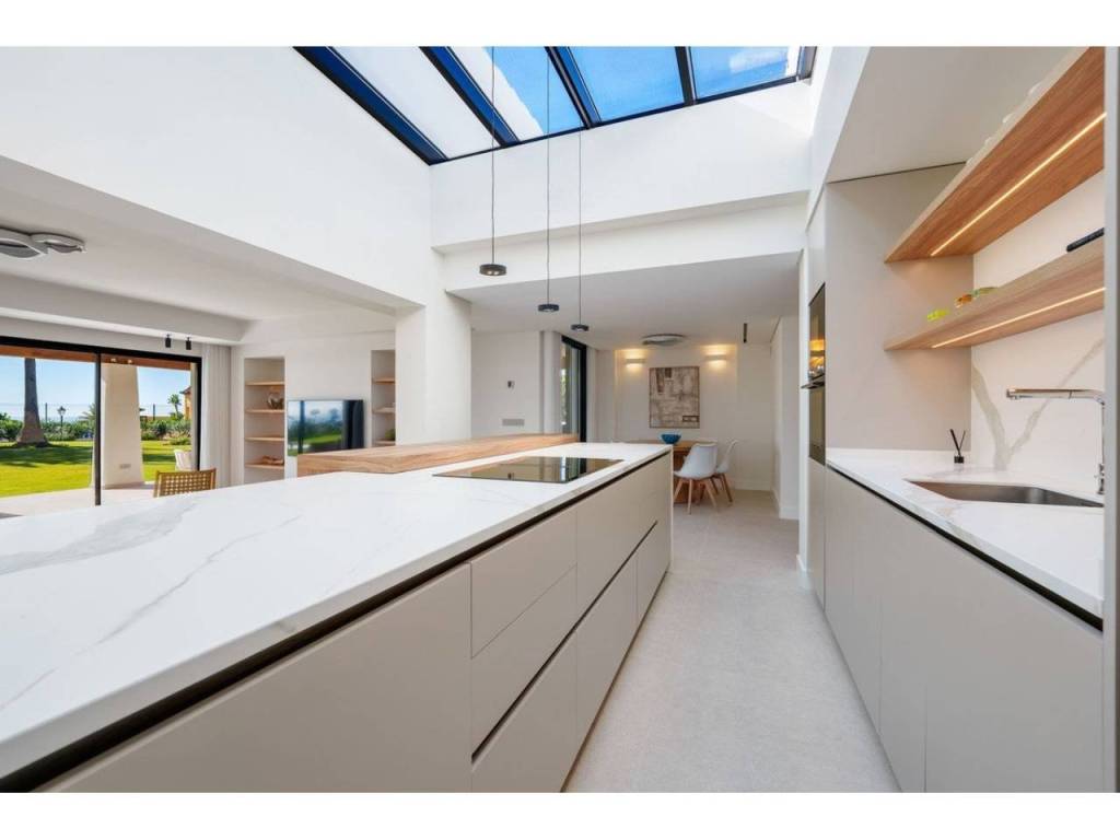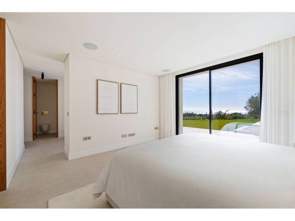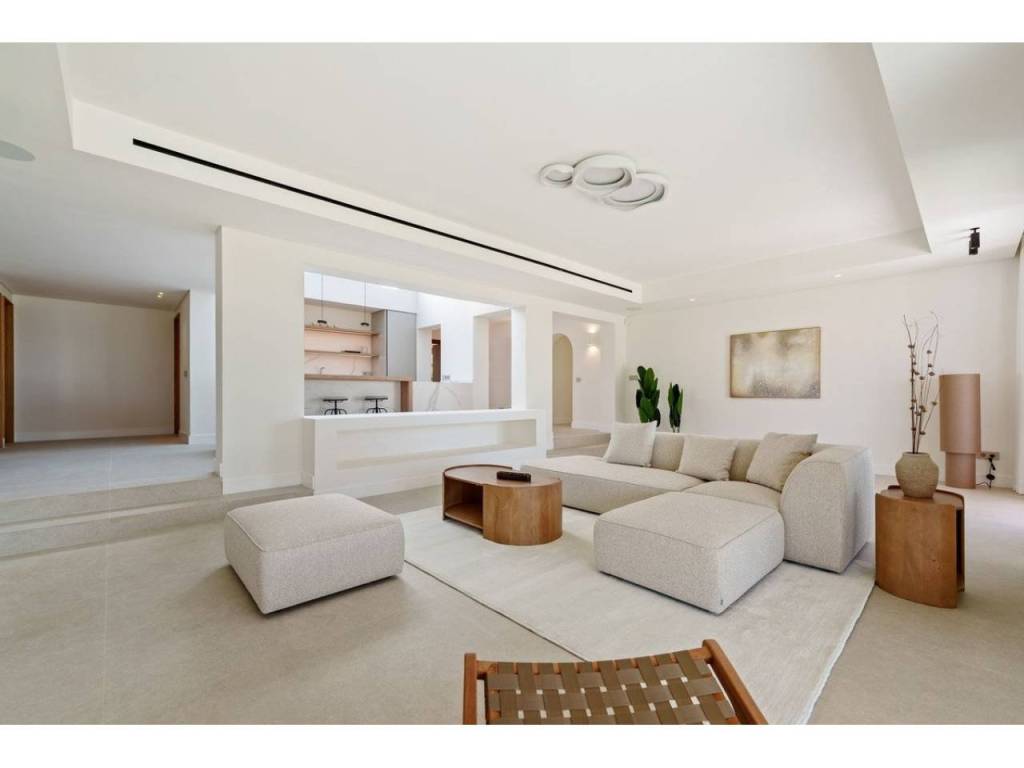 Defined by a refined minimalist aesthetic, the architecture features soft neutral tones, high-quality finishes, and large floor-to-ceiling windows that allow natural light to illuminate every corner. The single-level layout creates an effortless flow between the lounge, dining space, and designer kitchen, with all primary living areas opening directly to the surrounding gardens.