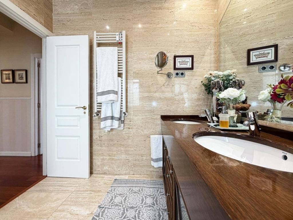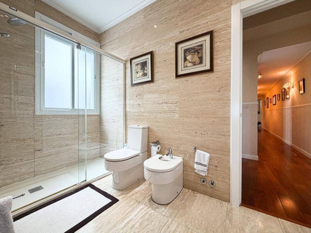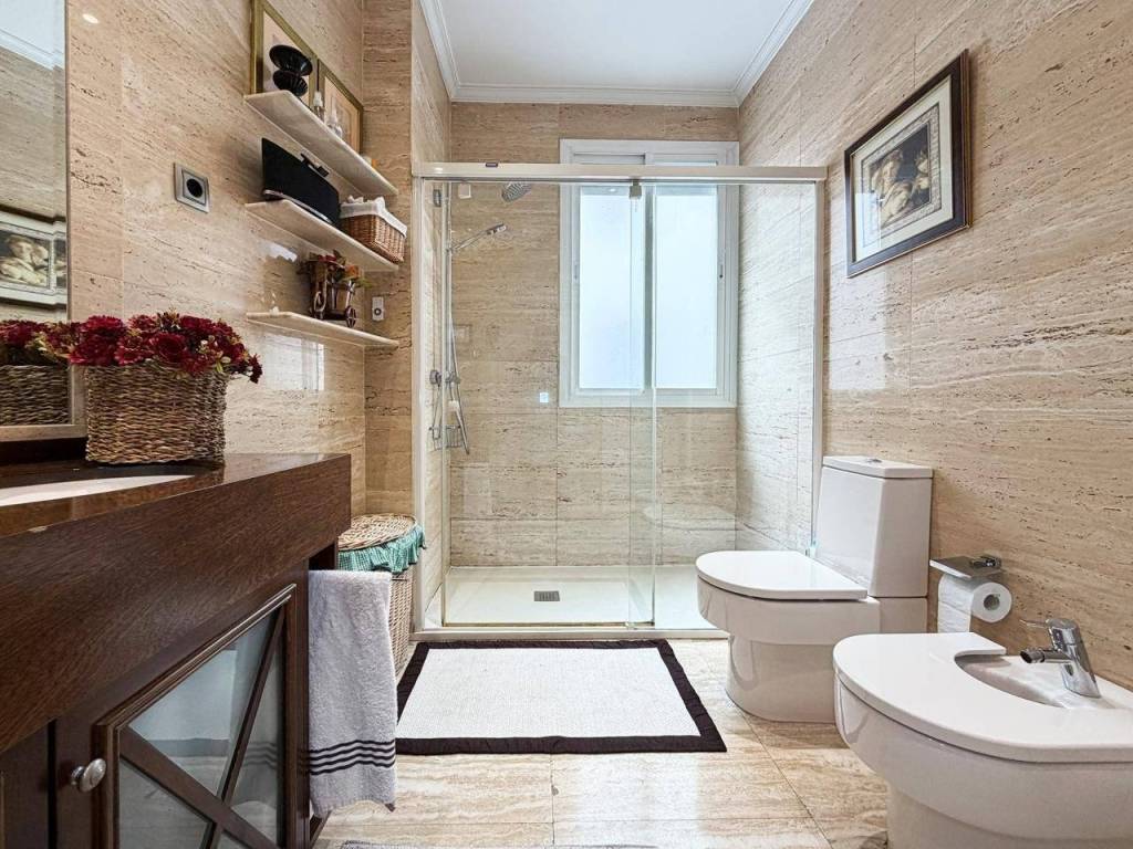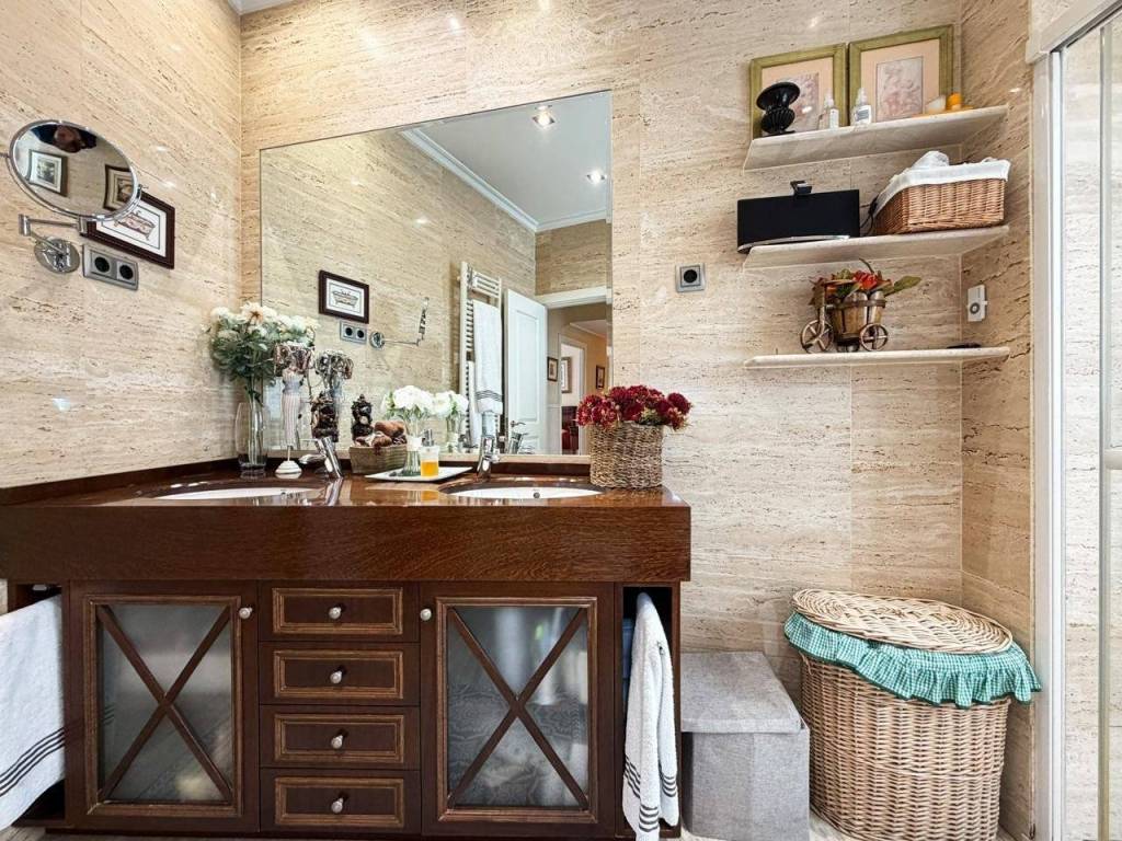 - 2 Baños Completos: Impecable y bañado en luz natural, este espacio destaca por su estado de conservación y una ventilación óptima que garantiza el máximo confort. El baño principal es un manifiesto de diseño: revestimientos en mármol travertino de alta gama combinados con un mueble artesanal en madera de Iroco