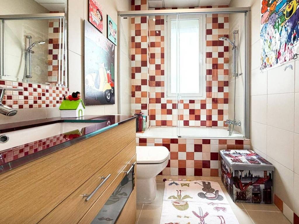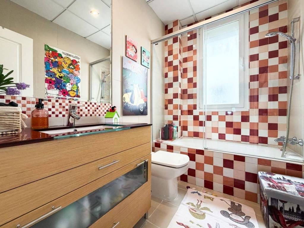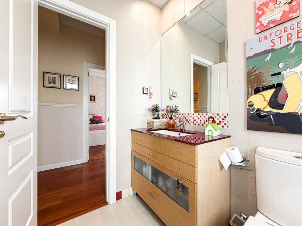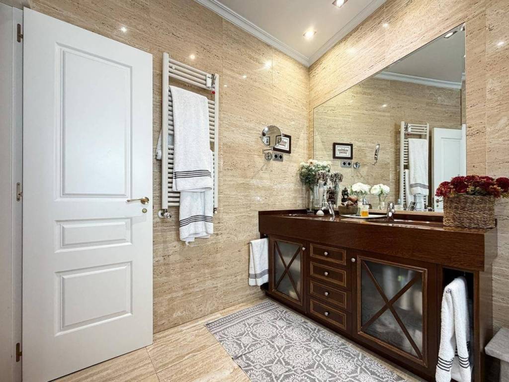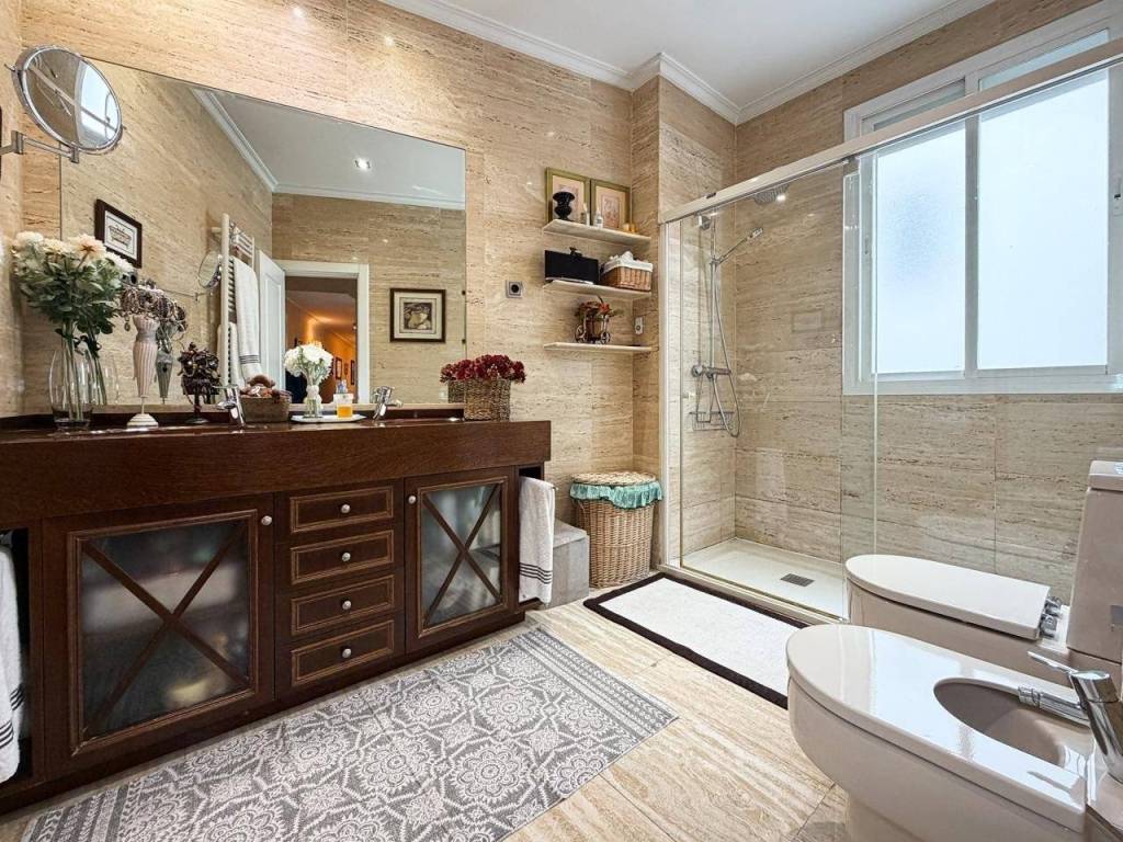 - 2 Baños Completos: Impecable y bañado en luz natural, este espacio destaca por su estado de conservación y una ventilación óptima que garantiza el máximo confort. El baño principal es un manifiesto de diseño: revestimientos en mármol travertino de alta gama combinados con un mueble artesanal en madera de Iroco