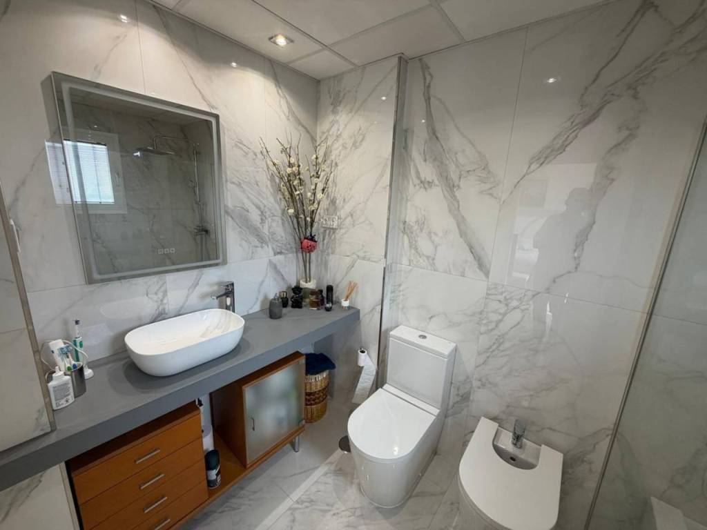 The upper floor is dedicated to the master bedroom, which offers an en-suite bathroom, large wardrobes, and its own private terrace with panoramic views — a perfect spot to start the day overlooking the sea.