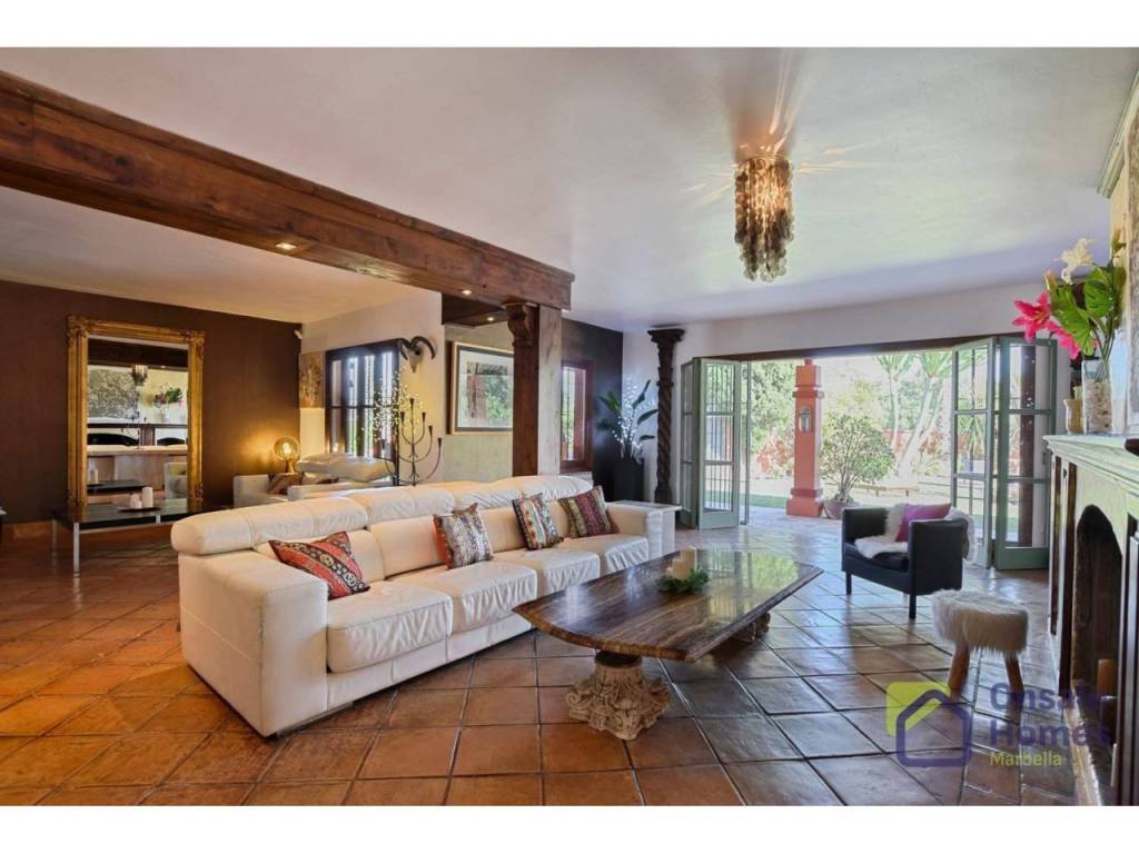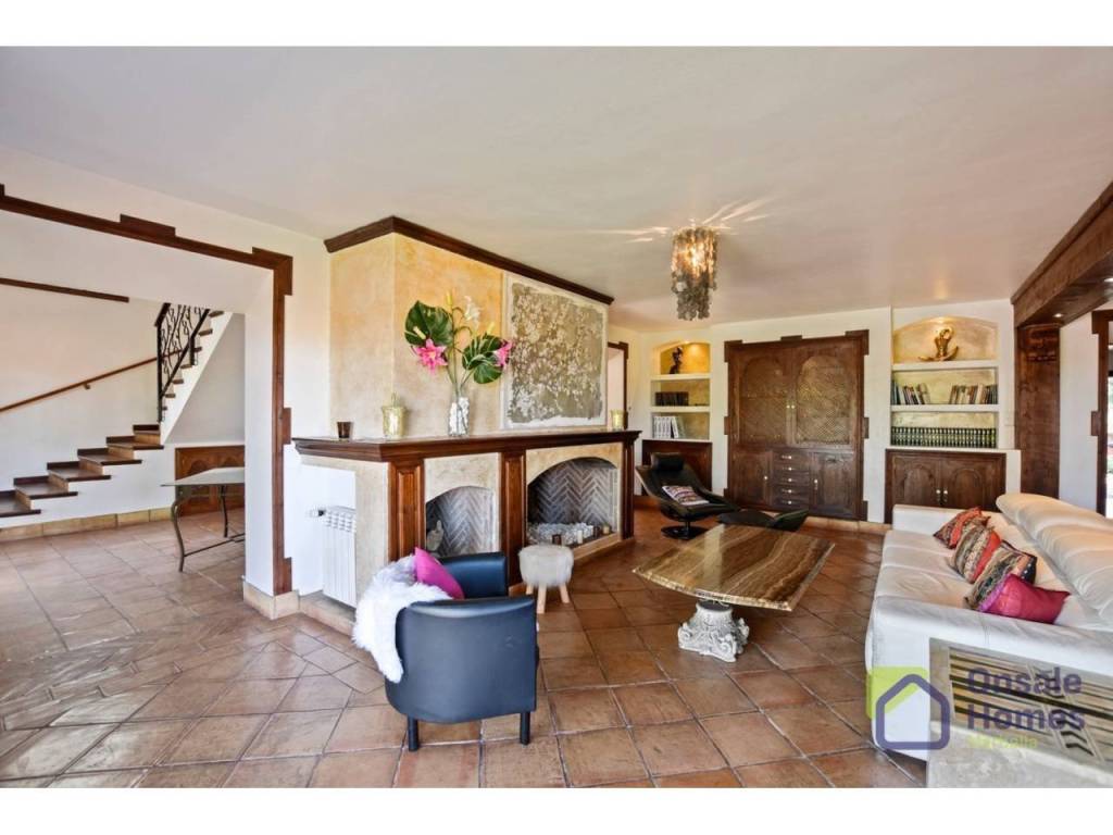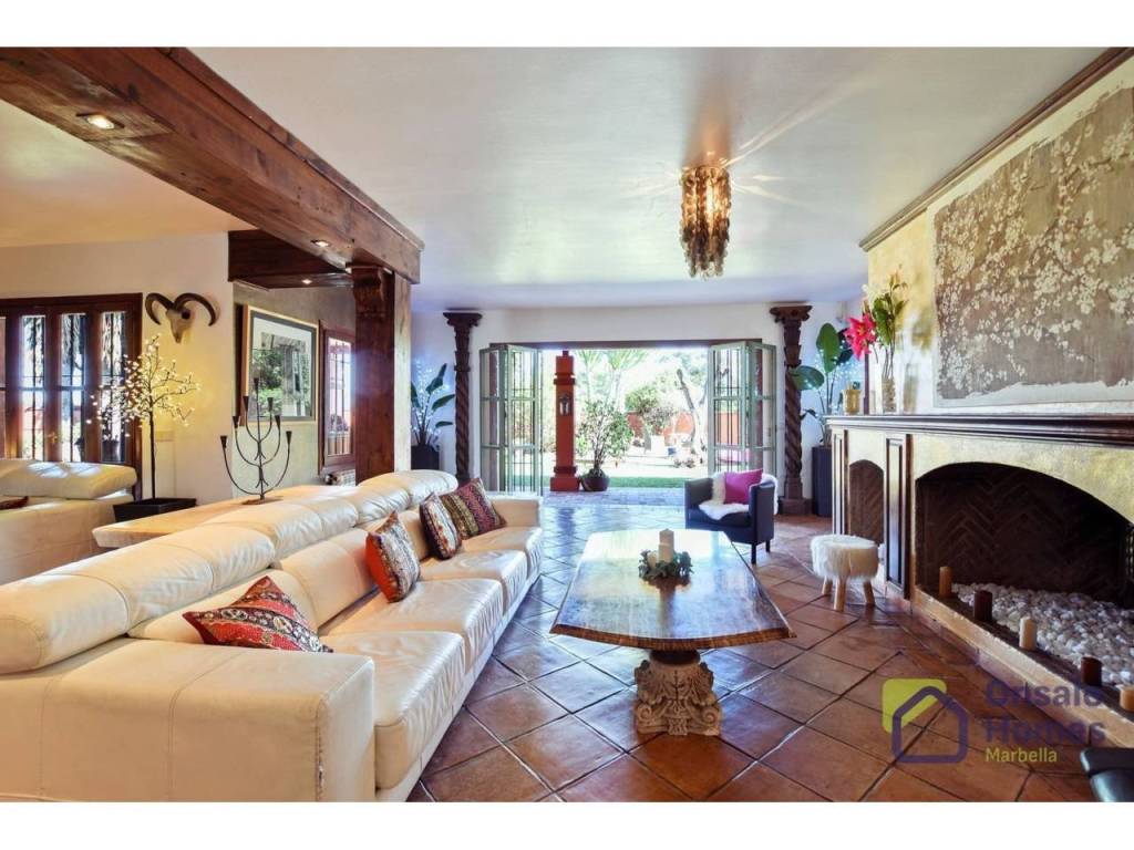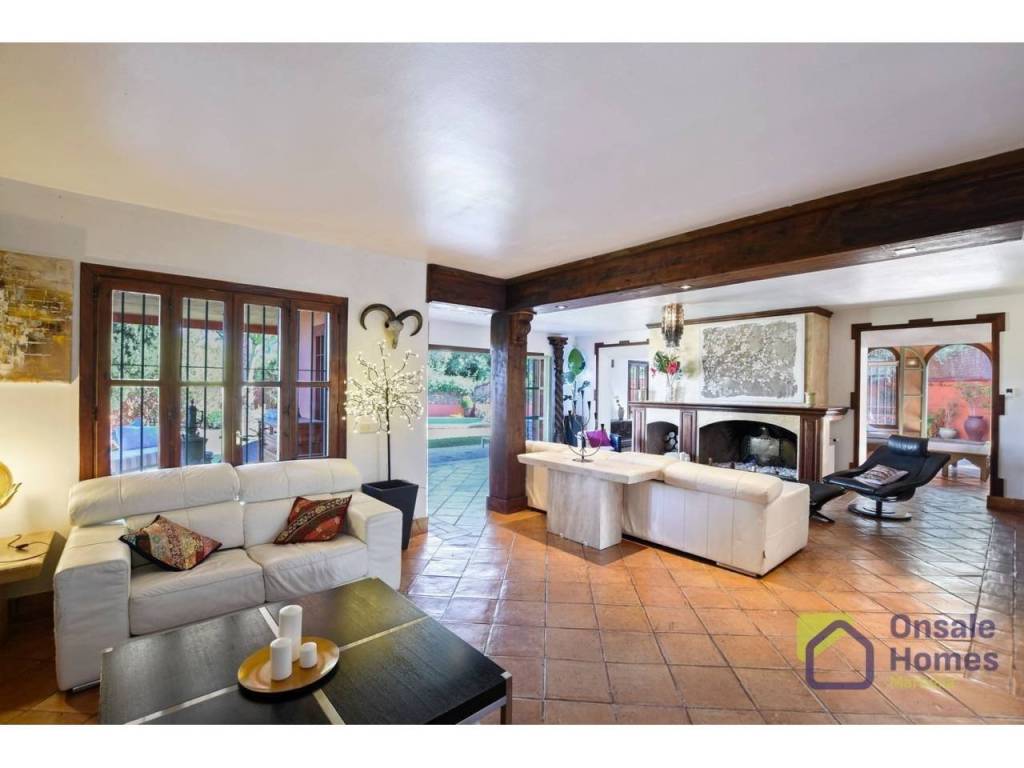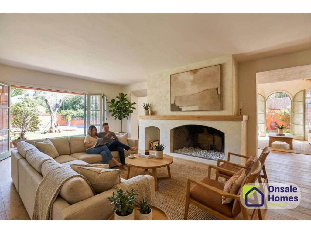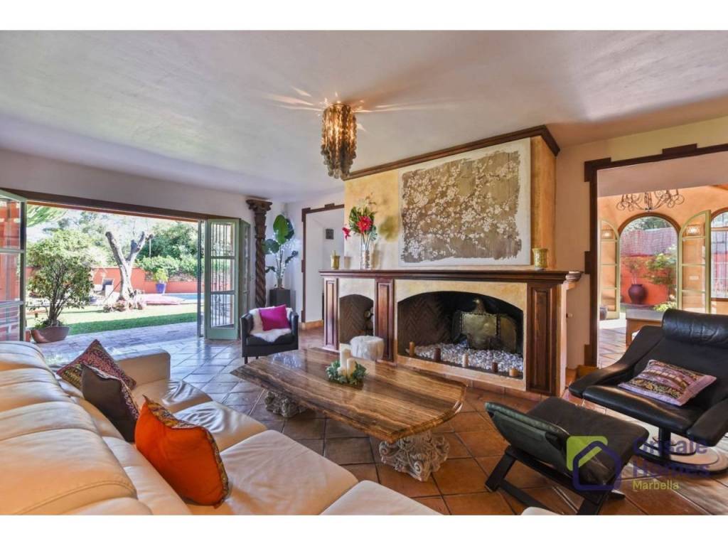 Main Living Room: A spacious living room with a large fireplace offers direct access to the terrace and garden, creating the perfect space to enjoy both indoor and outdoor living.
