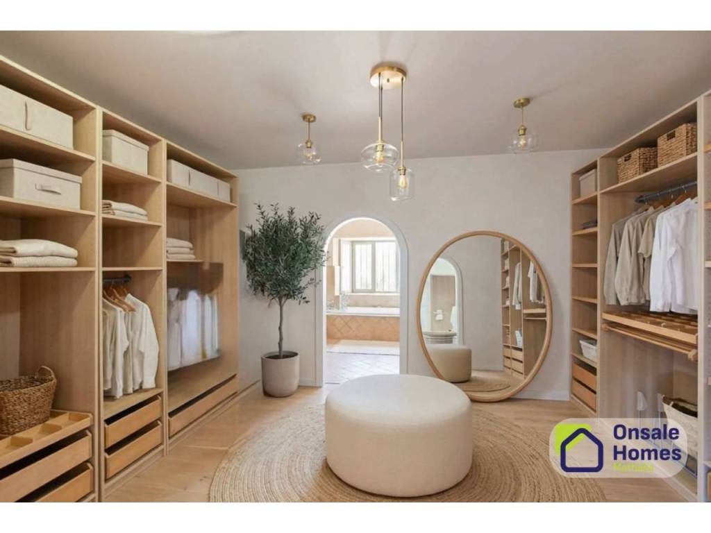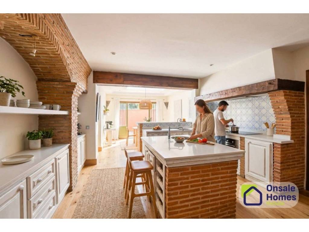 The villa is spread over two perfectly integrated floors. From the main entrance, you are welcomed by a charming garden leading to a covered porch. Inside, the entrance hall includes a guest toilet and leads to an impressive, spacious, fully equipped kitchen. The kitchen features a separate dining area, illuminated by a beautiful skylight, creating a warm and inviting atmosphere at any time of day.