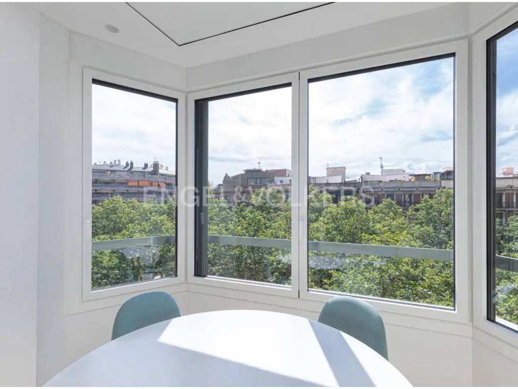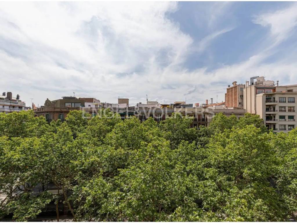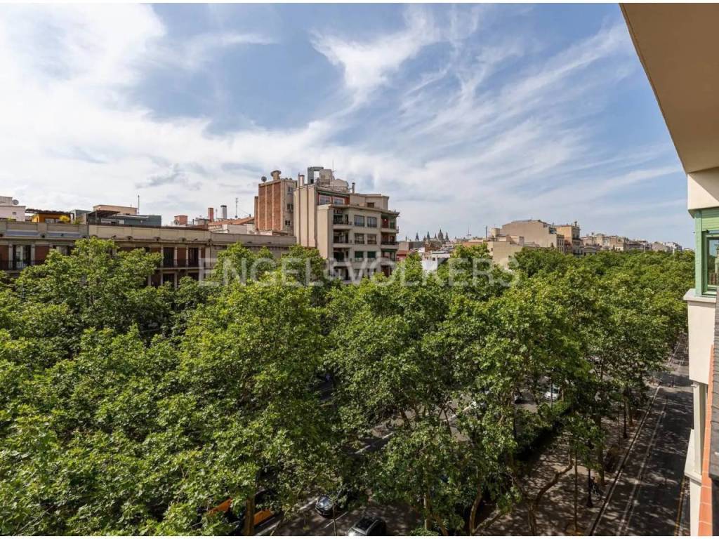 Cuenta con 5 habitaciones, 2 baños completos y amplio salón con vistas abiertas. El piso es tanto exterior como interior, ya que el salón está perfectamente aislado y da a la Gran Via desde una 5ª planta real, mientras que del lado de las habitaciones tiene una galería cubierta con gran ventanal que da al amplio patio de manzana típico del Eixample.