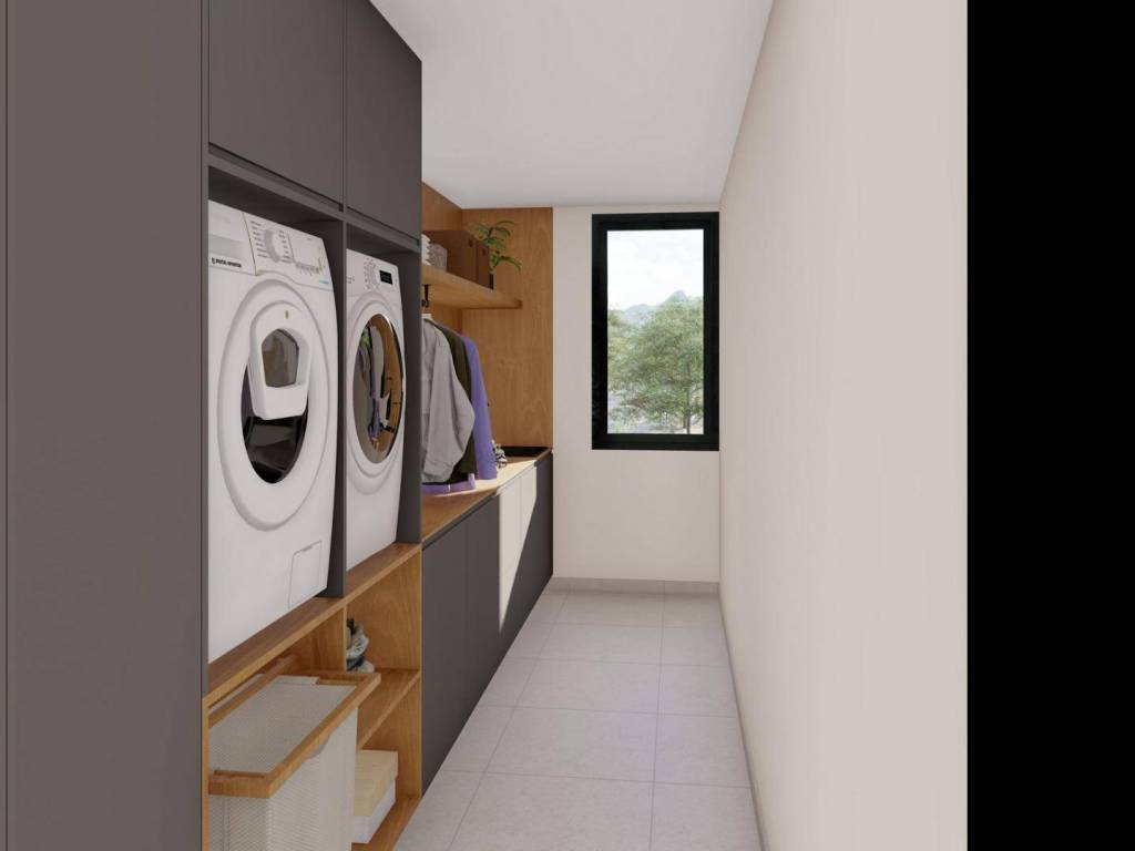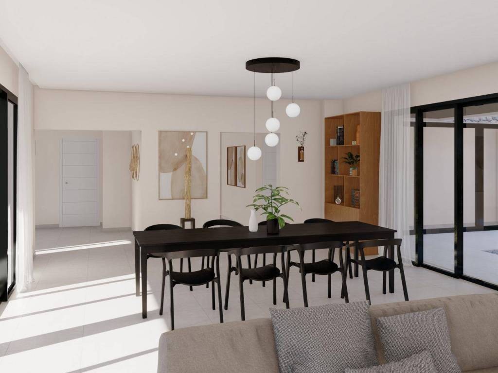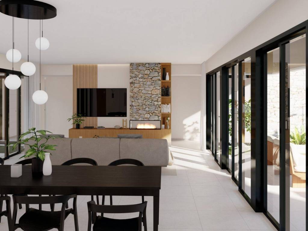 The day area has an open design, combining kitchen, dining room and living room in a large space with large windows that give access to the outdoor area with large terraces, the garden and the private pool.