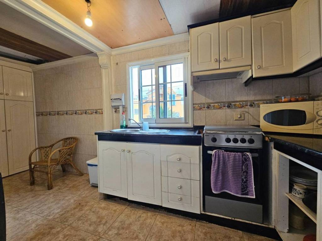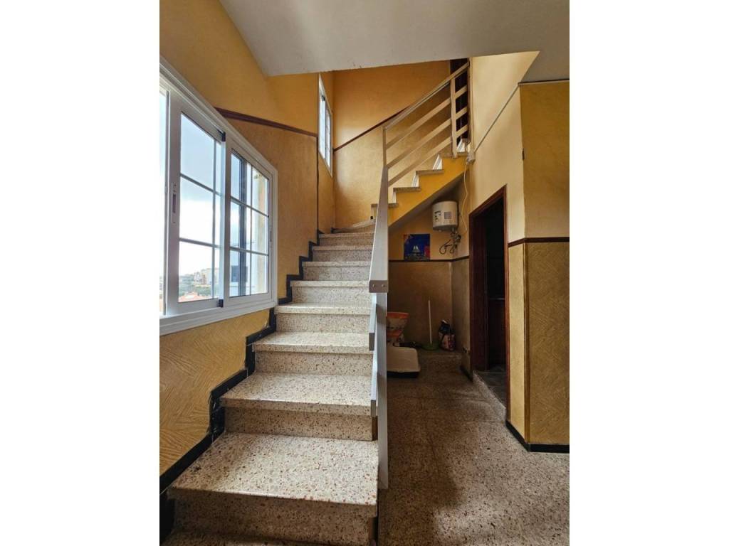 Piso tipo Dúplex en Telde zona Jinamar ( zona del pueblo) 147 m. de superficie, 8 m2 terraza, una habitación doble y 3 habitaciones sencillas, un baño, con area e instalaciones para un segundo baño, propiedad para reformar, cocina sólo muebles, carpinteria interior de madera, orientación oeste, suelo de gres, carpinteria exterior de aluminio.