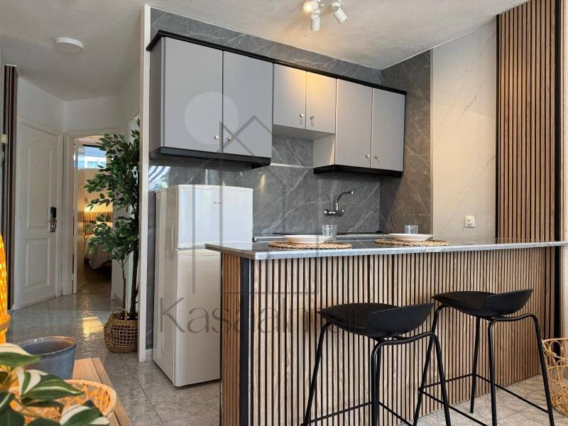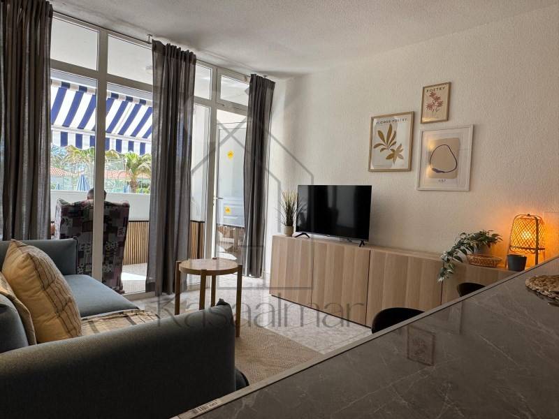 Kasaalmar, presents in the centre of Playa del Inglés, a few steps from the famous Yumbo, the beaches and the Dunes, supermarkets, restaurants, pharmacies, public transports, Apartment situated on the first floor of a well kept building with swimming pools, tennis court and gardens. It is divided into a spacious bedroom, a bathroom and a living room/kitchen leading to a very nice terrace, pleasant and quiet all year round with direct access to the pool and gardens. The flat is ideal to live in, long or short term or to rent long or short term.