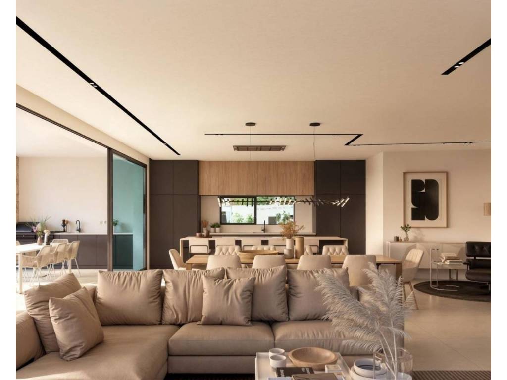 Built on a generous 912 m² plot, this villa features a total of 350 m² constructed area across two floors. The home includes 4 bedrooms with en-suite bathrooms plus a guest toilet, all finished with top-quality materials. The ground floor presents a bright open-plan living and dining area seamlessly connected to a modern kitchen with central island. From here, large sliding doors open directly to the terrace, summer kitchen, and private pool. A bedroom with en-suite bathroom, a guest toilet, a laundry room, and a versatile multipurpose room complete this level.