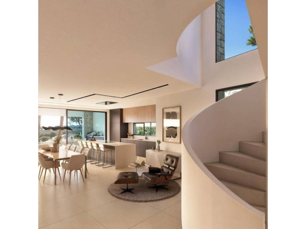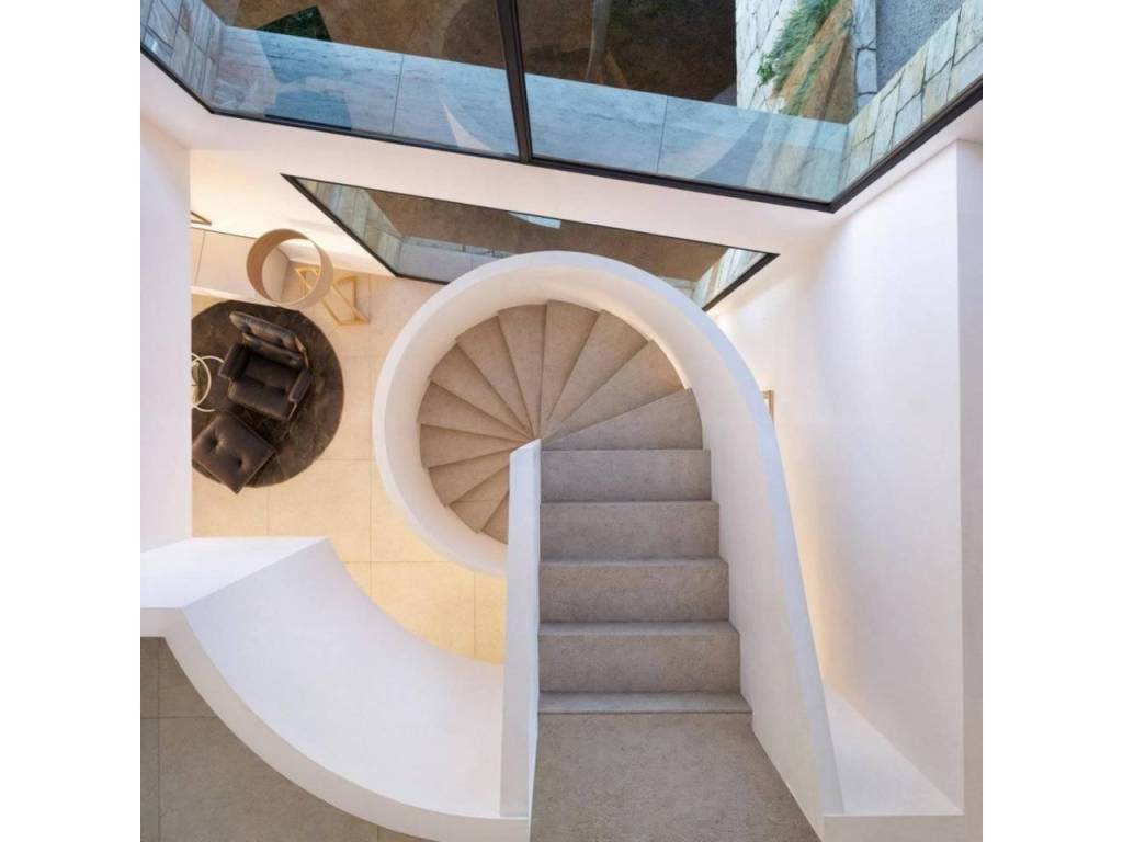 A designer staircase leads to the upper floor, which hosts three additional bedrooms with en-suite bathrooms, as well as a spacious entrance hall and private terrace with spectacular sea views. The property also offers a garage, private parking, underfloor heating, air conditioning, double glazing, and a reinforced security door, ensuring maximum comfort and peace of mind.
