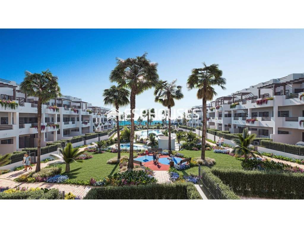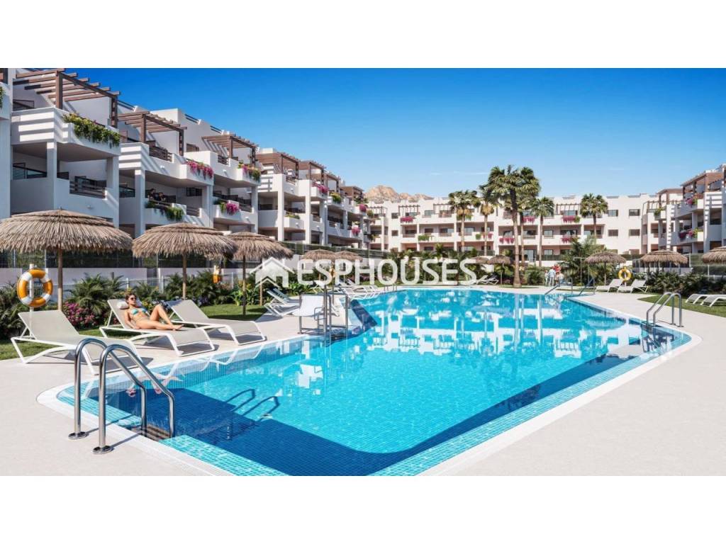 A residential complex of 1, 2, and 3-bedroom apartments on Los Nardos beach, on the Costa Almeria, southern Spain. The apartments are located a short walk from Los Nardos Beach and La Entrevista Beach on the Almería coast, near the towns of Águilas and Vera. The complex boasts spacious interior spaces, beautiful gardens, and plazas featuring a large communal swimming pool with a jacuzzi, bordered by a large natural grass lawn with showers, sun loungers, and thatched parasols. The complex also offers shared Wi-Fi. The spacious communal areas also include a children's play area within a secure gated community. This residential complex has a lot to offer: excellent amenities (bars, restaurants, supermarket, boutiques, ATM, chiringuito bars on the beach, etc.), a peaceful location in a spectacular natural setting, access to all daily services, and excellent sports facilities. Mar de Pulpí is an attractive and luxurious residential coastal town on the Costa de Almería in southeastern Spain, near San Juan de los Terreros. The area is known for its Andalusian architecture, peaceful atmosphere, and excellent, mild climate. With direct access to beaches such as Playa de Los Nardos and the proximity of the spectacular Pulpí Geode (the largest public geode in Europe), this destination offers a perfect combination of seaside relaxation, modern amenities, and unique natural and historical attractions.