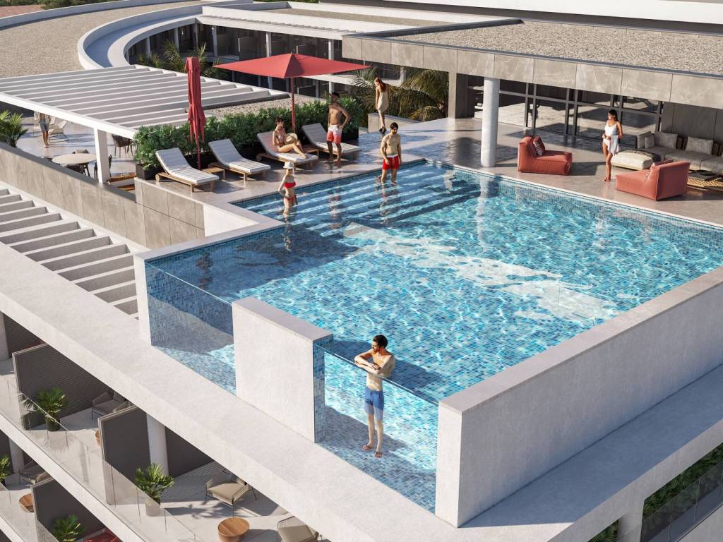 The complex will offer high-end communal areas, including swimming pools, a spa, gym, wellness center, and gourmet restaurant, as well as an impressive rooftop bar with a glass infinity pool, where you can enjoy open views of the Atlantic Ocean and spectacular sunsets.