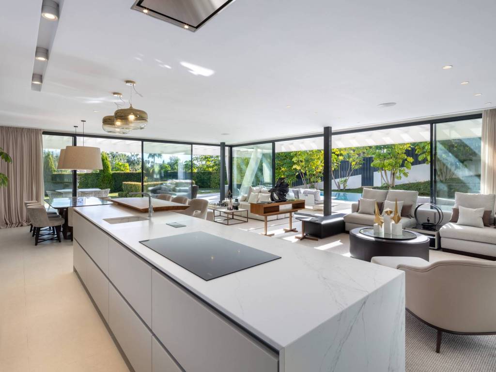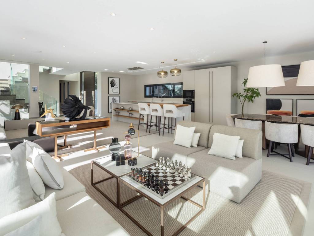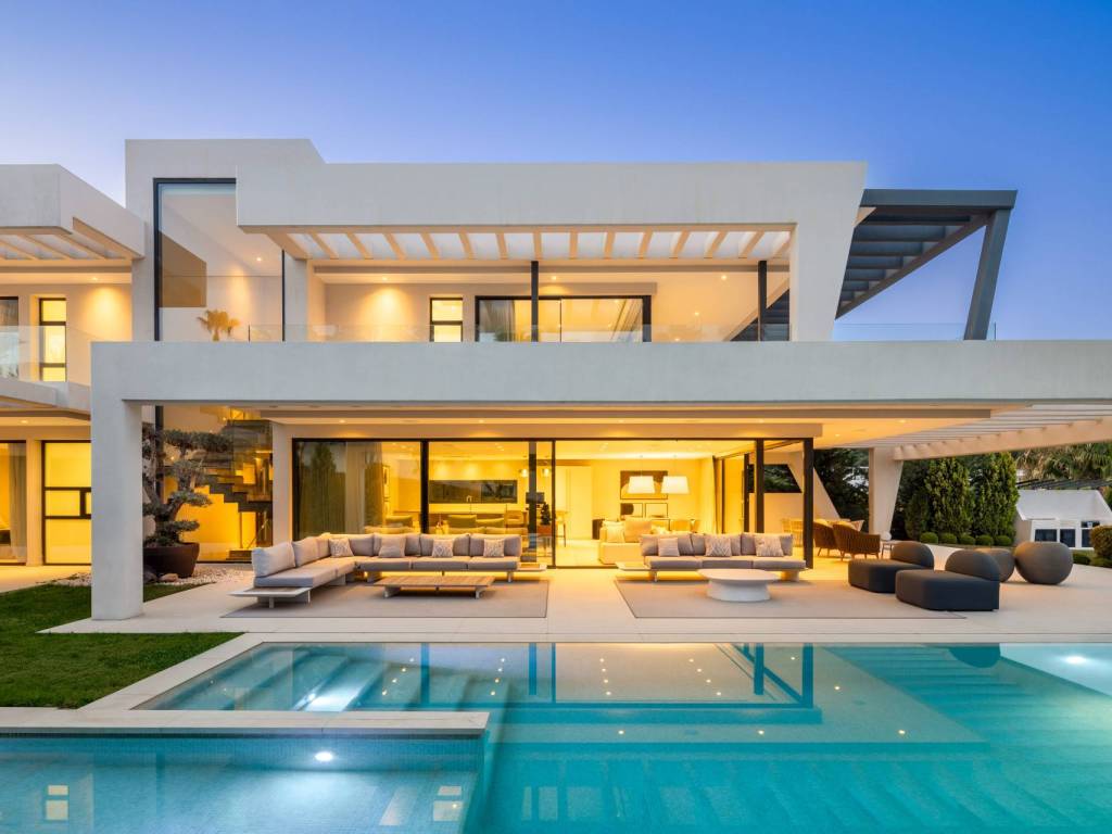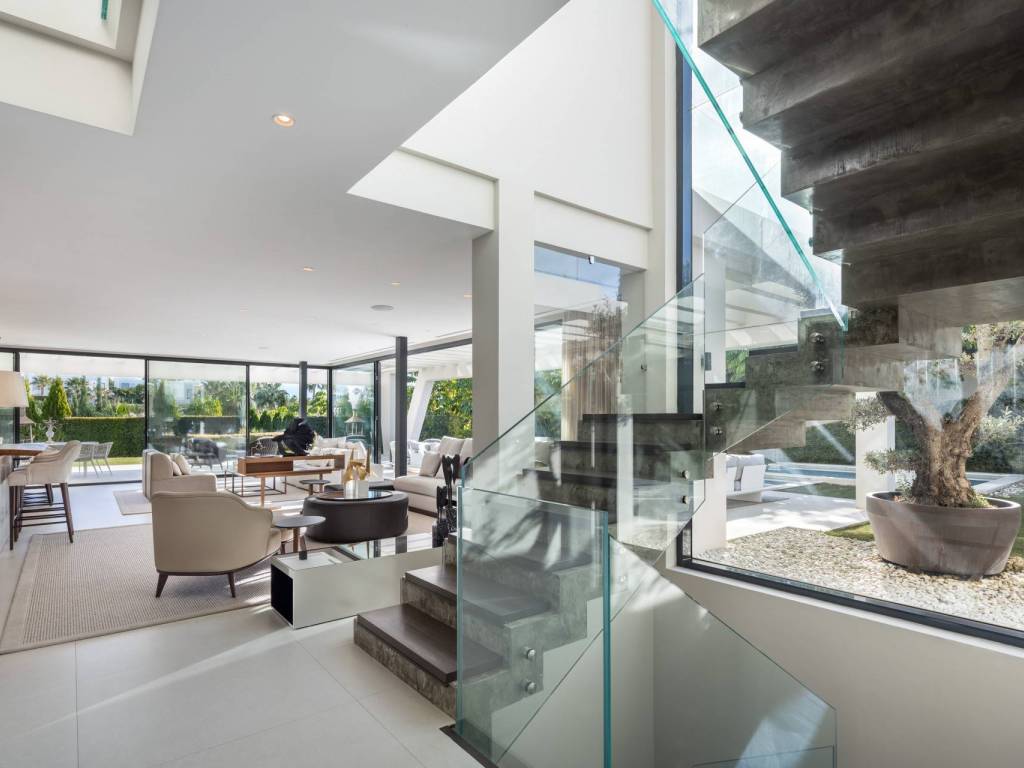 This exceptional modern villa is situated in the heart of Nueva Andalucía, Marbella, Malaga, just steps away from the renowned Los Naranjos golf club. The property is also a short drive from the vibrant Puerto Banús and the prestigious Marbella Golden Mile. Spanning across three levels and sitting on a generous 1,420m2 plot, this residence boasts a stunning manicured garden that enhances its appeal.