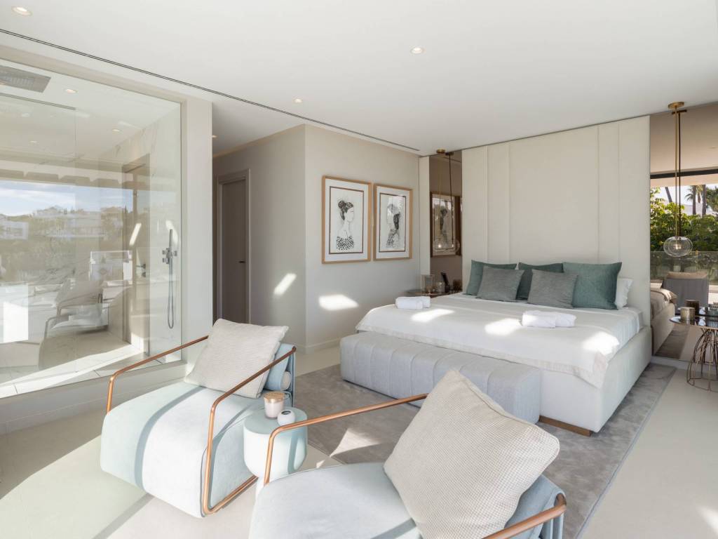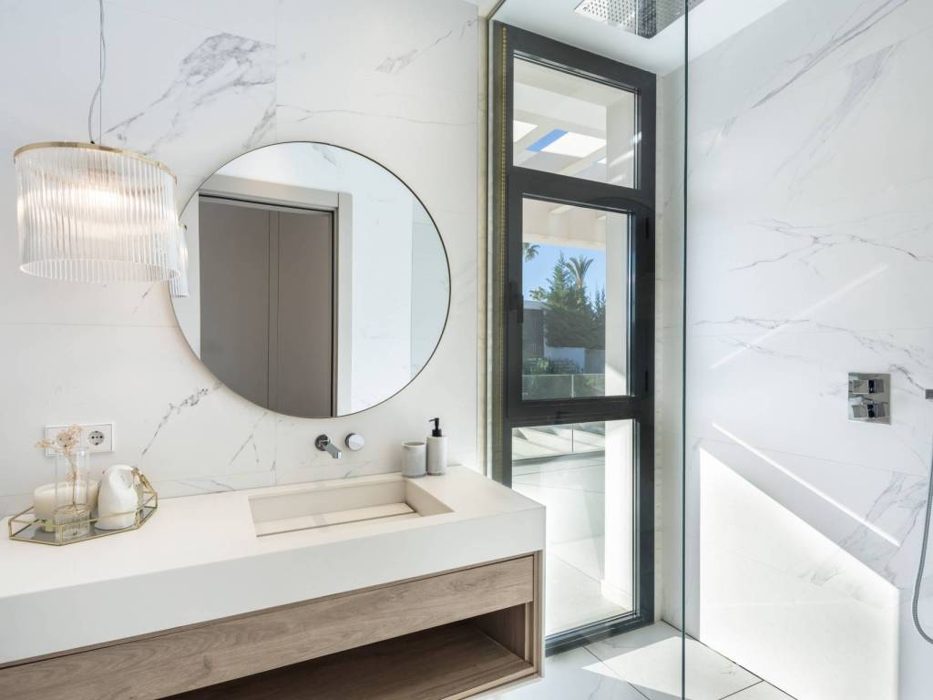 The versatile basement level includes a laundry room, a cosy TV lounge, a Turkish bath, and ample storage space. This level is designed to cater to various needs, offering both functionality and leisure. The combination of modern design, prime location, and comprehensive amenities makes this villa a truly exceptional property in Nueva Andalucía.