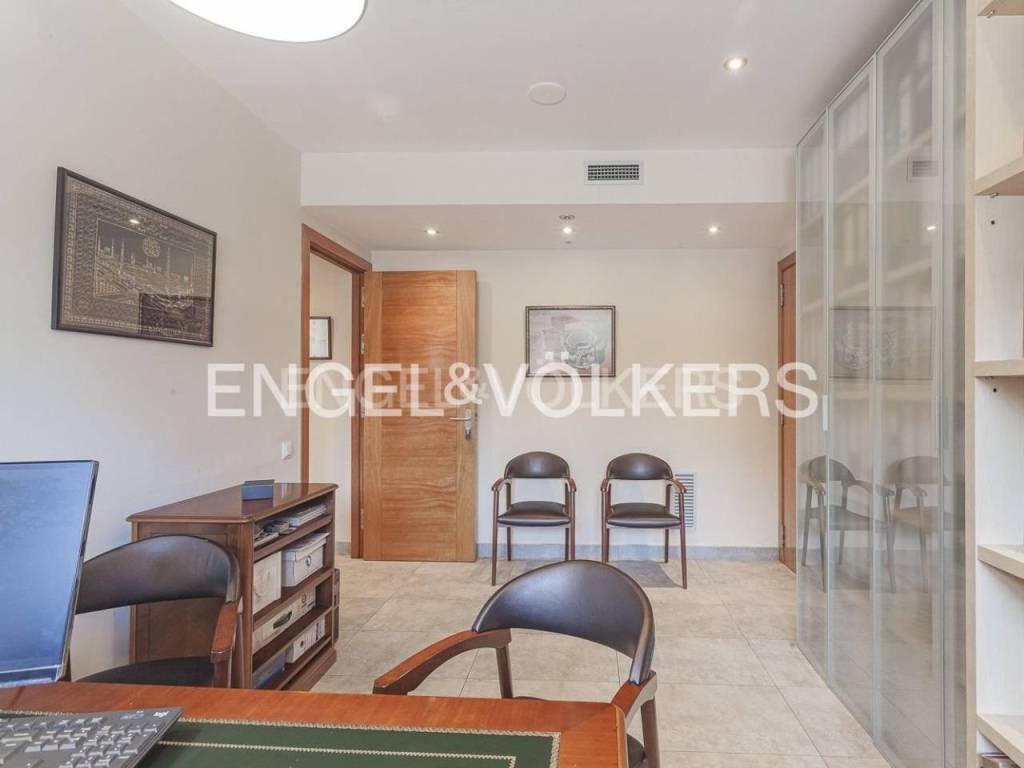 El acceso principal conduce a un elegante distribuidor que articula los espacios de la vivienda. Esta planta alberga un amplio salón con vistas y acceso directo al jardín posterior y la piscina, un comedor independiente de generosas dimensiones, y una cocina de diseño equipada con mobiliario de alta gama y salida al jardín frontal. Completan esta planta un dormitorio principal con vestidor y baño en suite, además de un despacho independiente.