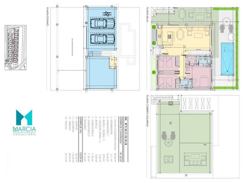OBRA NUEVA. Excelente VILLA Independiente con altas calidades. Dispone de una superficie de 141,56 m2 constr. Consta de tres dormitorios, salón comedor, cocina amueblada y equipada, dos baños (uno en suite). Cuenta con terraza de 28,94 m2 y SOLARIUM de 116,40 m2. Toda la edificación consta de dos alturas. Adicionalmente dispone de garaje de gran superficie 46,22 m2 y trastero de gran volumen 29,10 m2. Todo ello, en una magnífica parcela privada de 247,56 m2 con zona ajardinada y área de piscina de 70,12 m2. Orientación Oeste.