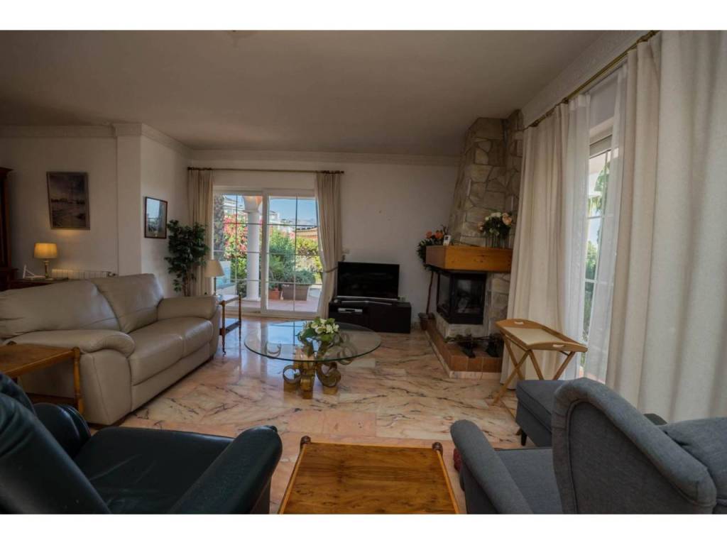 The main living space is bright and generously proportioned, featuring a spacious living and dining area with fireplace, creating a warm and inviting atmosphere during the cooler months. Large openings connect directly to the terraces and outdoor areas, seamlessly blending indoor and outdoor living.