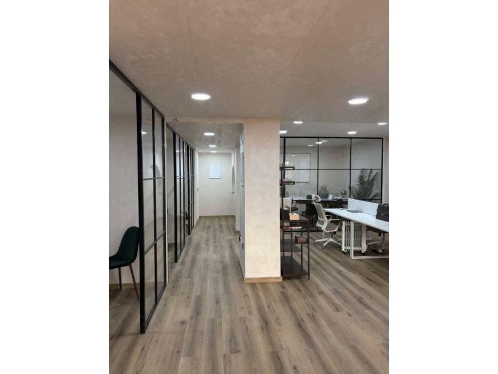 En la parte trasera se encuentra una zona muy versátil que incluye cocina completamente equipada (frigorífico americano doble, lavavajillas, microondas, etc.), baño y una gran sala con ventanas al exterior, actualmente equipada con una mesa de trabajo. Este espacio puede adaptarse fácilmente como sala de reuniones, área de trabajo adicional o dividirse en más despachos según las necesidades de la empresa.