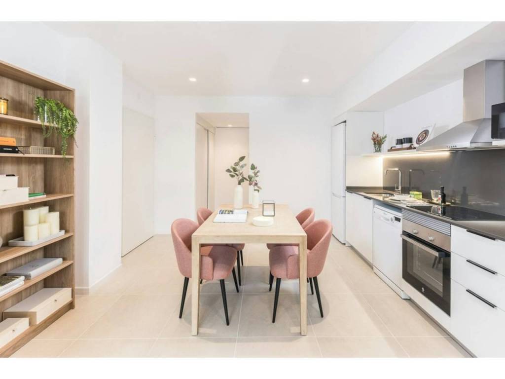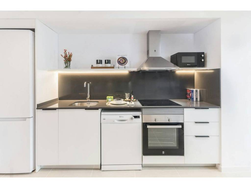 La cocina americana reformada, con todos los electrodomésticos (nevera, vitrocerámica, campana extractora, horno, microondas, lavadora, lavavajillas).