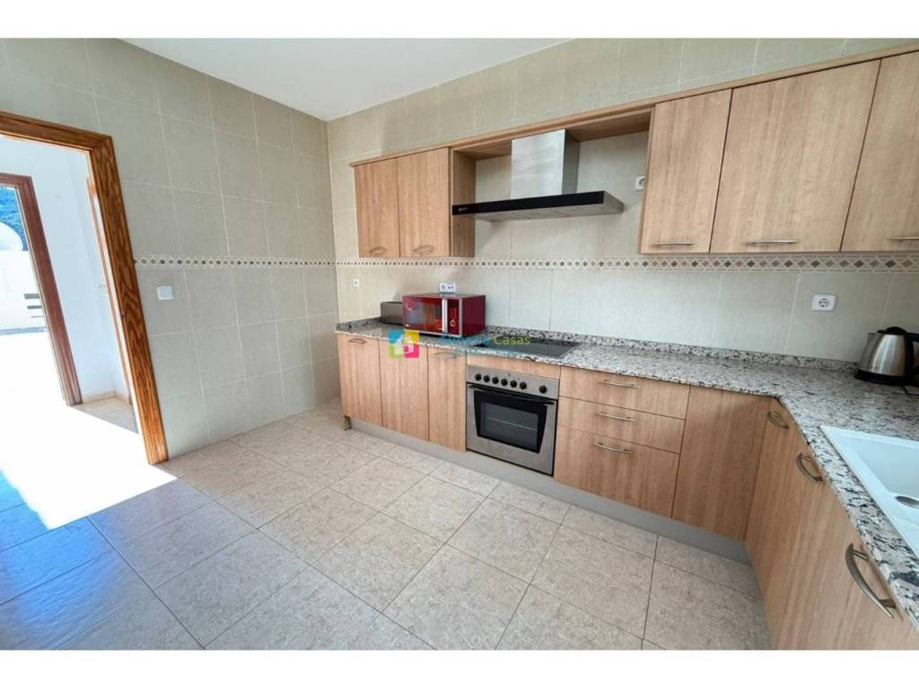 La cuisine entièrement équipée se trouve en face de la porte principale et comprend une gamme complète de meubles. Une porte mène à la buanderie avec chauffe-eau électrique et évier, donnant accès à l’arrière de la villa.