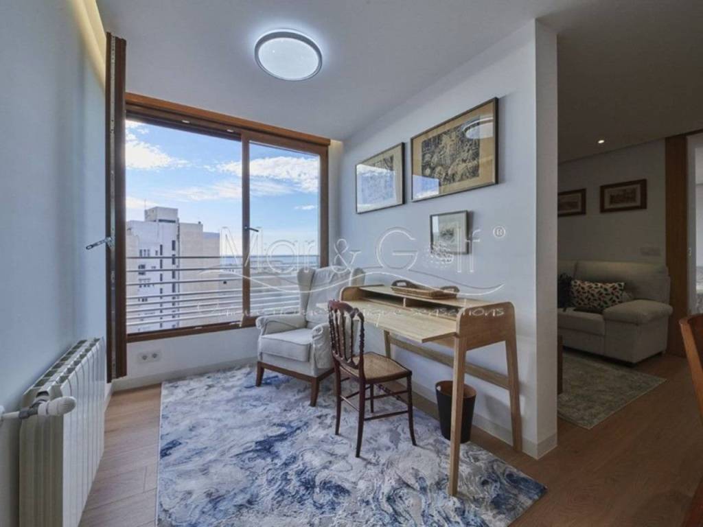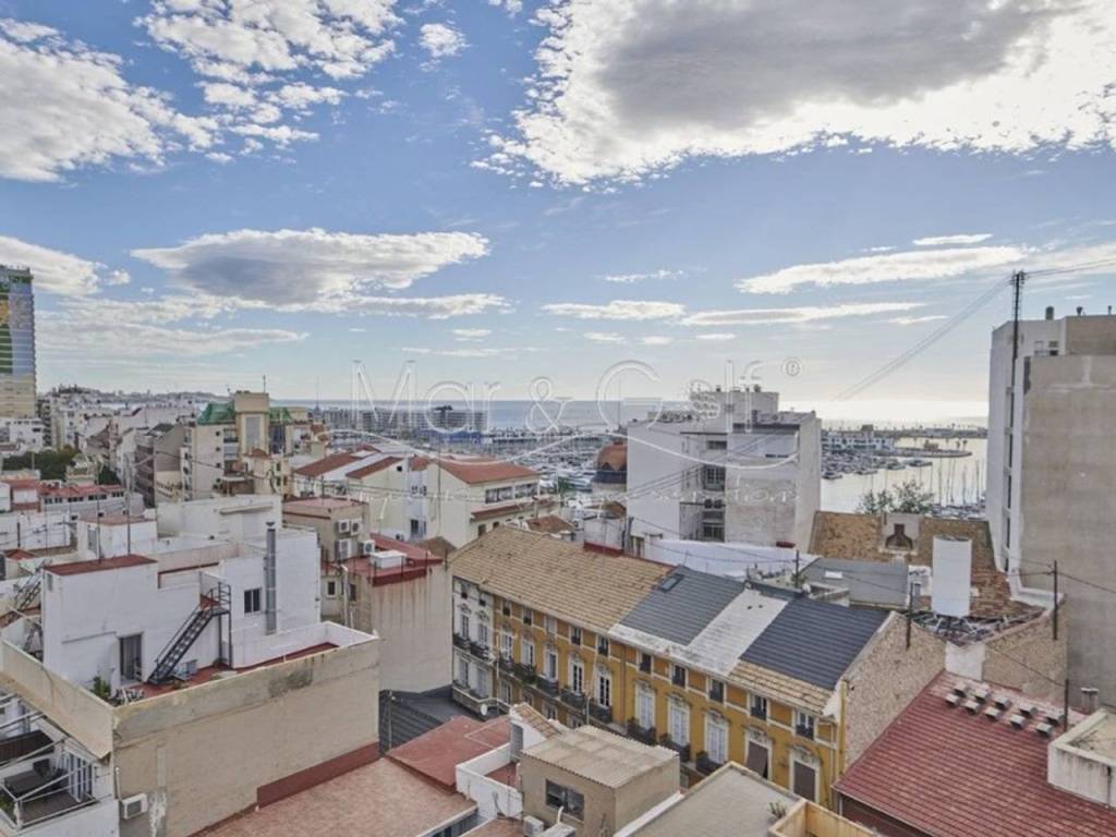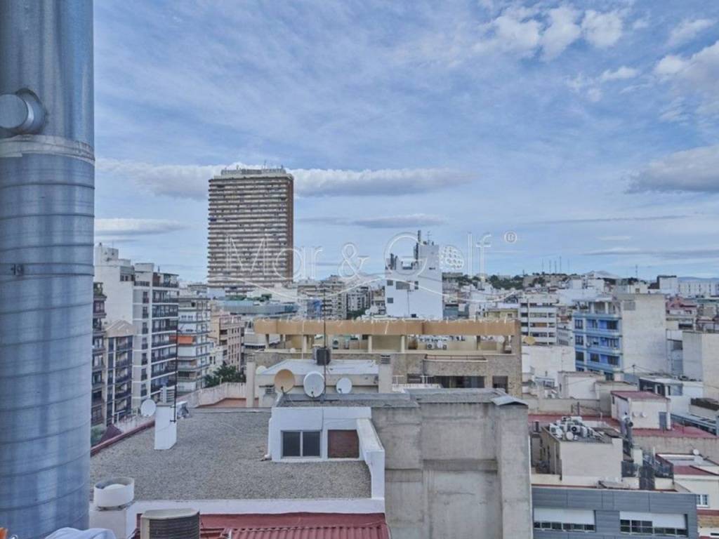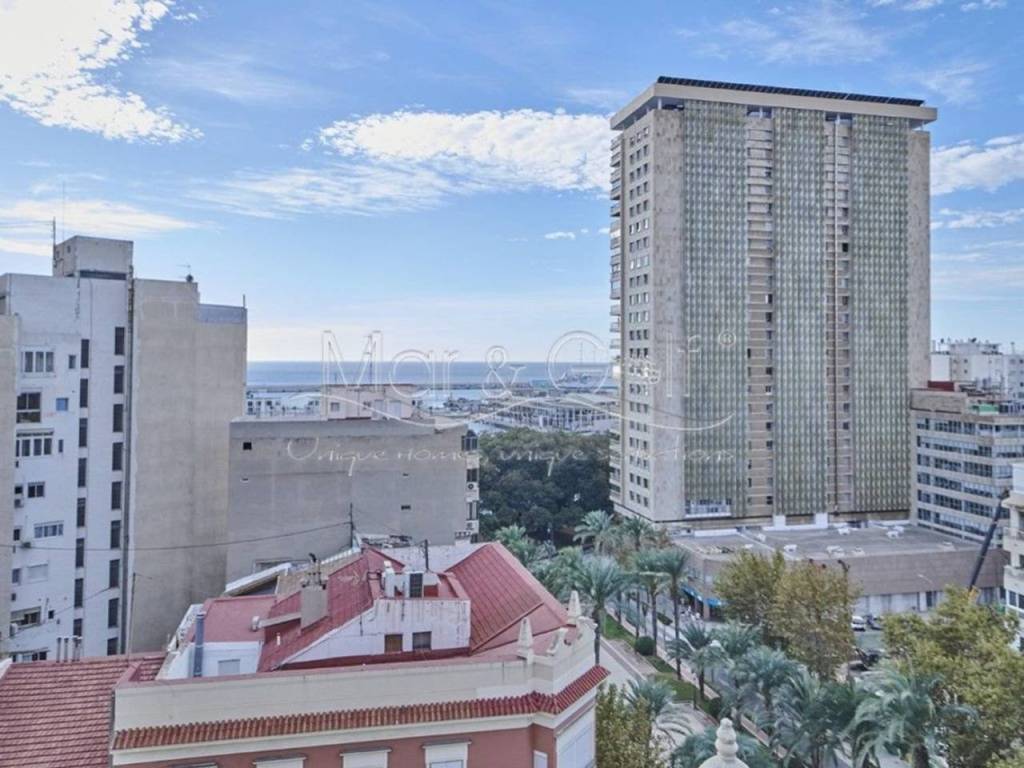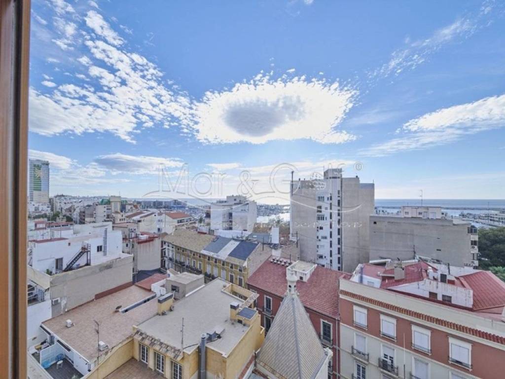 Desde su novena planta se divisan desde el Cabo de las Huertas hasta el puerto de Alicante por su orientación sur y el centro de la ciudad por su orientación norte. Dada su altura es una vivienda con gran luminosidad que unido a su decoración pensada hasta el último detalle hace de este piso un hogar acogedor y cómodo en el centro de la capital alicantina.