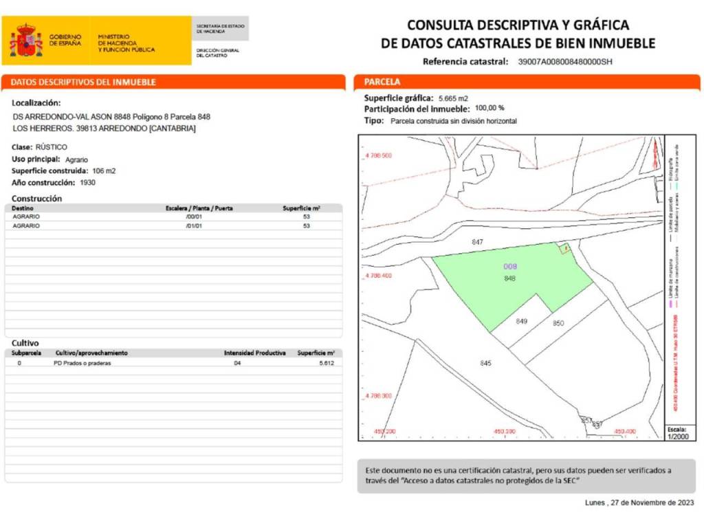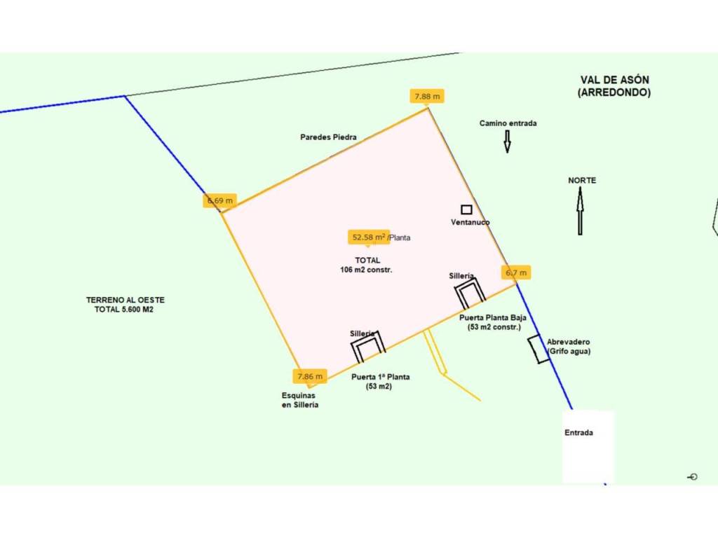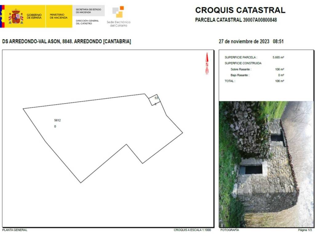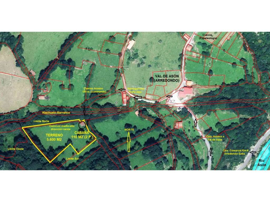 (Regardez la vidéo pour une visite virtuelle). Cabane en pierre indépendante à rénover, de 106 m2 de construction sur 2 étages sur un terrain de 5 665 m2 à Val de Asón (Arredondo-Cantabrie). Accès par la route jusqu'au village, puis un chemin de 200 m à pied (possibilité de réparation). Elle dispose d'eau de source et n'a pas d'électricité. Mesures extérieures, 6,7 m x 7,8 m. Rez-de-chaussée de 53 m2 de construction (40 m2 utilisables), sans cloisons, avec une hauteur de 1,8 m, des murs droits, une fenêtre et une porte d'accès. Premier étage de 53 m2 de construction (40 m2 utilisables), sans cloisons, avec une hauteur, une porte d'entrée, des murs droits, toit en tuiles à rénover. Le terrain où se trouve la cabane fait 5 665 m2, avec une pente, bordé d'arbres et de pieux, dédié au pâturage. Excellentes vues, très proche du parc naturel des Collados del Asón. Idéal pour les spéléologues, les randonneurs, les alpinistes ou les amoureux de la nature. À 2 km du village d'Asón, à 4 km d'Arredondo avec des services, à 15 km de Ramales (centre régional), à 35 km des plages de Laredo. À 1 heure de Bilbao et Santander. PRIX : 23 900 €.