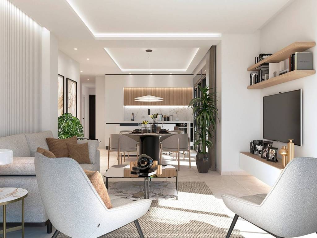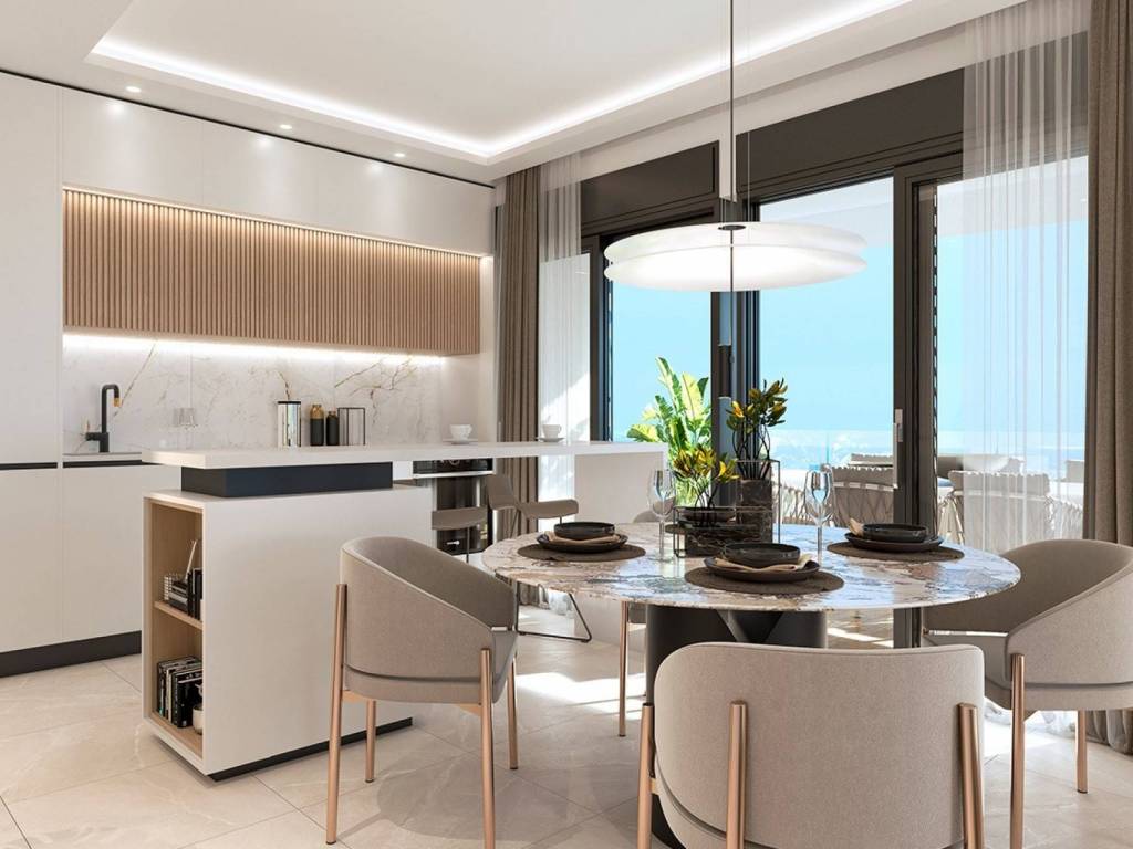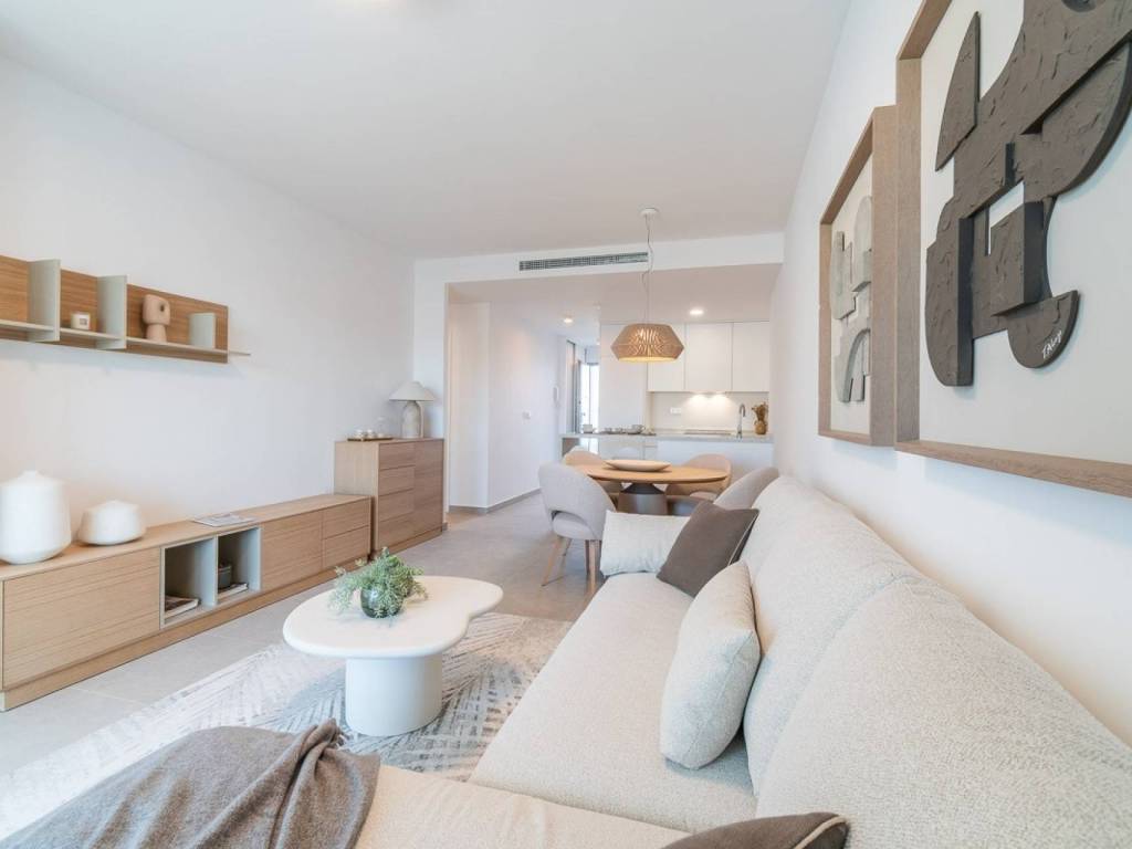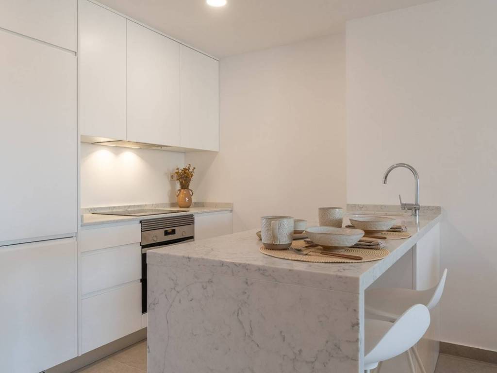 Cette troisième phase du complexe résidentiel propose 30 élégants appartements de 2, 3 et 4 chambres, tous avec des armoires encastrées spacieuses et entre 2 et 3 salles de bains. Chaque logement dispose d'un salon spacieux au design contemporain, d'une cuisine ouverte moderne avec des meubles de haute qualité et des plans de travail en quartz, de type Compac ou Silestone. De grandes baies vitrées coulissantes donnent accès à la terrasse avant, idéale pour profiter du climat méditerranéen.