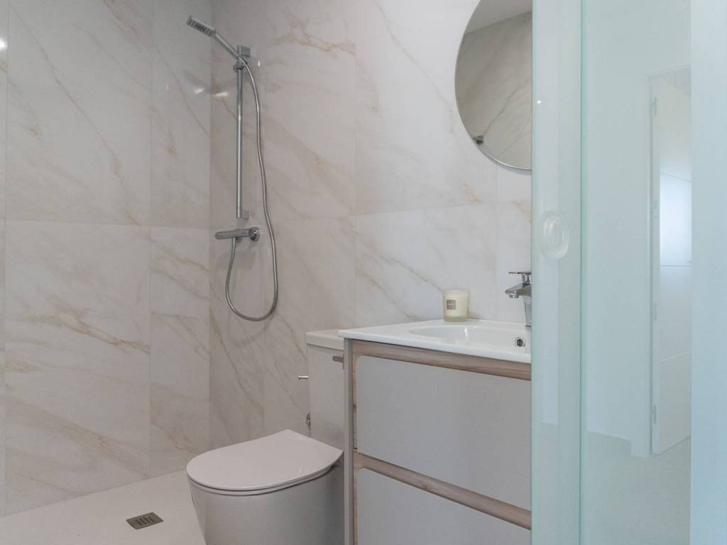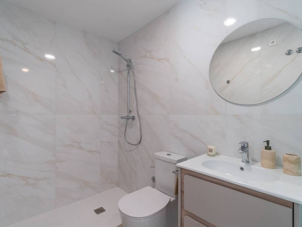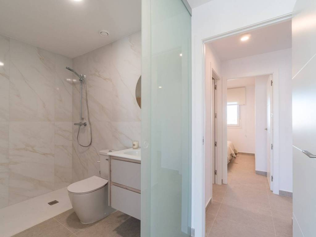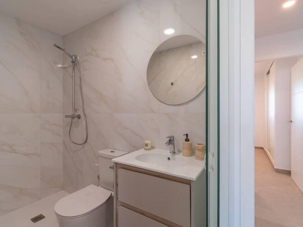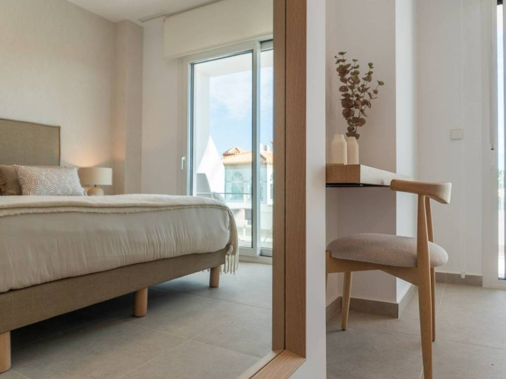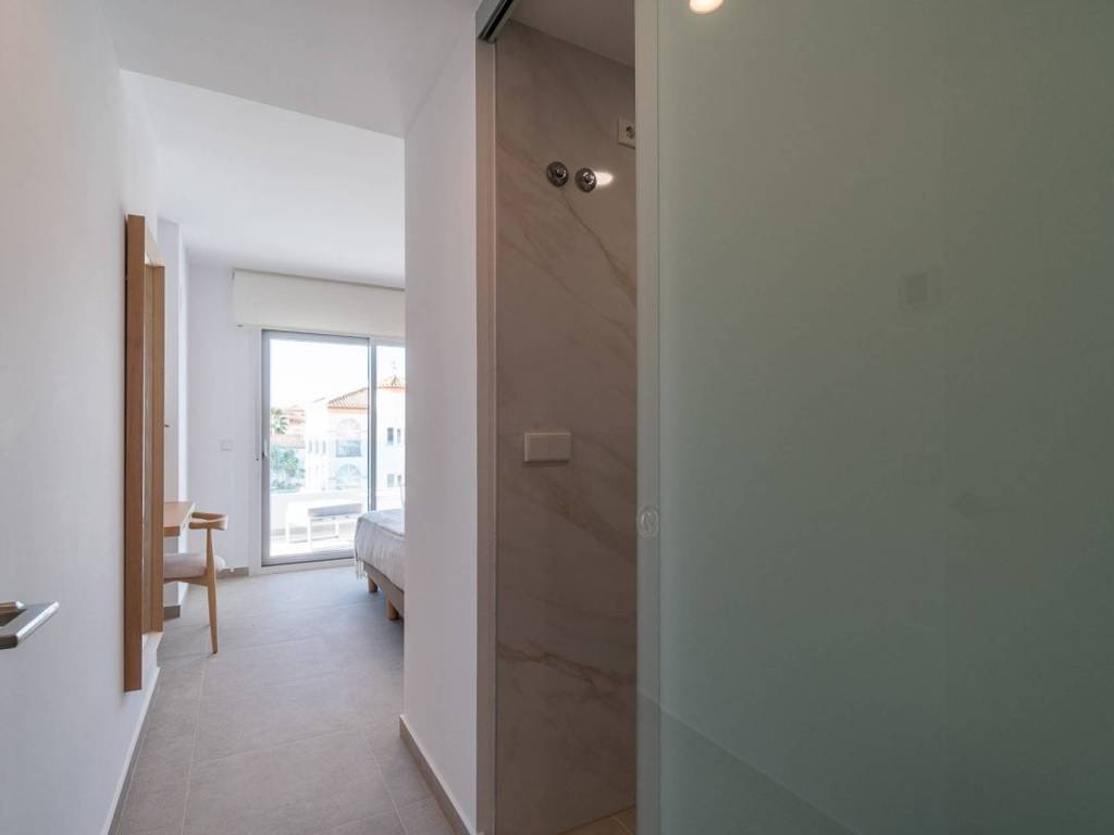 Fondations et structure: Béton armé avec fondations isolées et système antisismique.Façade et toitures: Esthétique méditerranéenne moderne, avec isolation thermo-acoustique et fermetures à haute efficacité énergétique, avec des finitions en mortier imperméable et un revêtement en porcelaine.Menuiseries: Intérieurs en MDF laqué blanc avec des armoires encastrées, et extérieurs en PVC avec double vitrage pour une isolation thermo-acoustique optimale.Installations modernes: Pré-installation de climatisation (chaud/froid), système de ventilation mécanique contrôlée et chauffage par le sol en option.Piscines et espaces communs: Trois piscines, dont une chauffée, entourées de jardins tropicaux luxuriants, ainsi que des zones de détente et une salle de sport entièrement équipée.