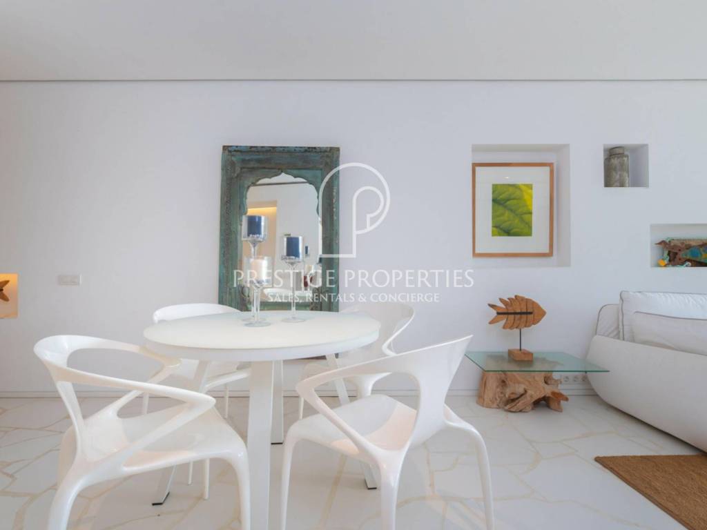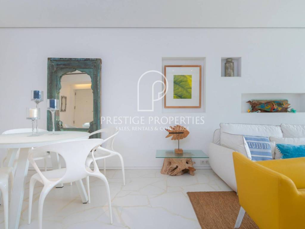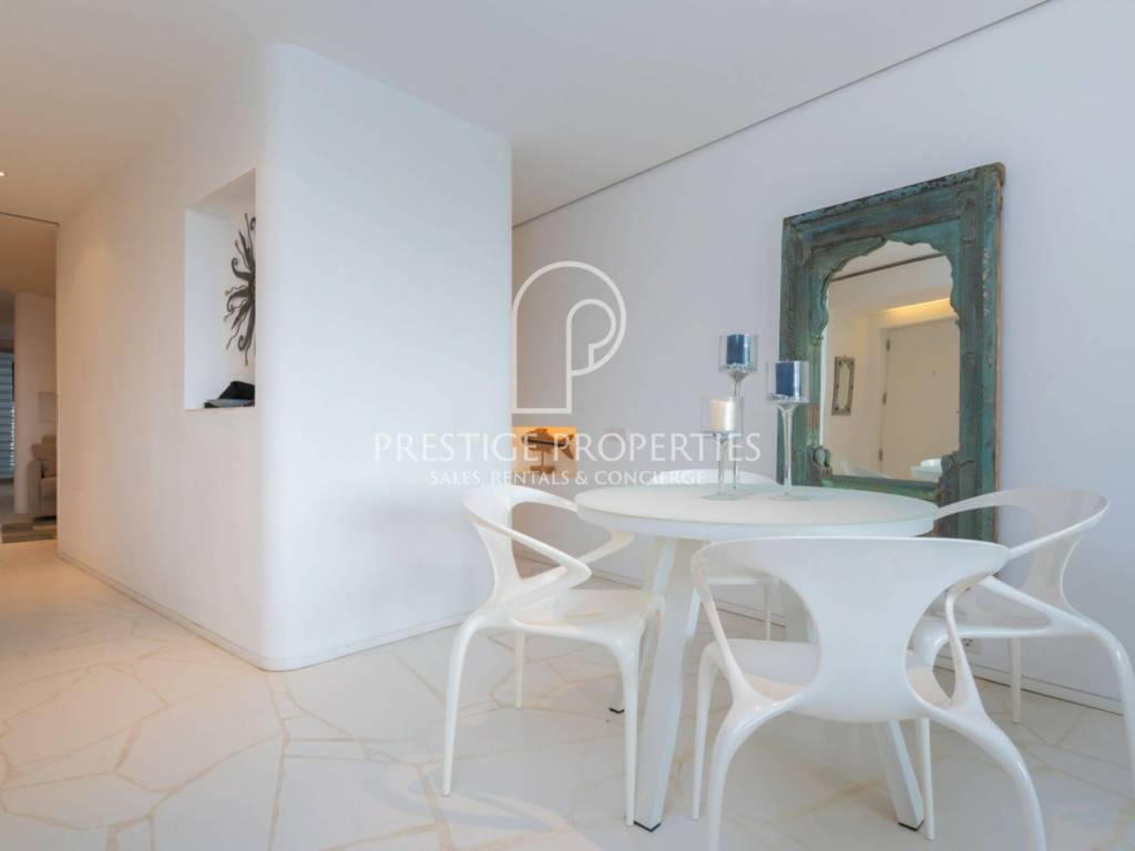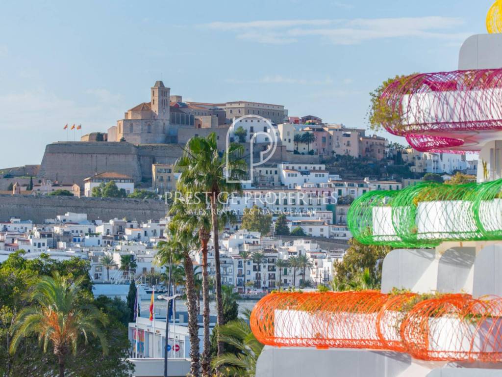 L'appartement jouit d'une vue imprenable sur la mer et la vieille ville d'Ibiza et est orienté sud-ouest, ce qui garantit une grande luminosité naturelle.