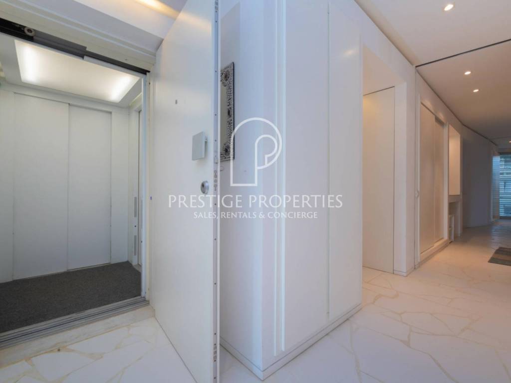 L'appartement est accessible soit par les escaliers de l'immeuble, soit par l'ascenseur, qui s'ouvre directement dans l'appartement.