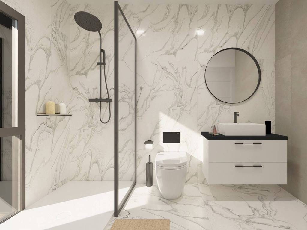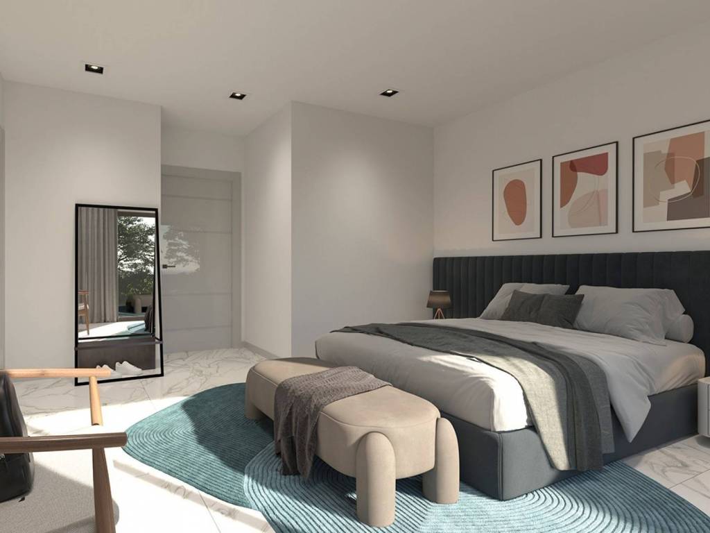 Chaque villa comprend trois chambres et deux salles de bains, conçues avec des matériaux de haute qualité. La chambre principale se distingue par son espace, son dressing et sa salle de bains attenante avec des finitions modernes. Les deux autres chambres disposent de placards intégrés et d'un accès direct au jardin, garantissant une connexion fluide entre les espaces intérieurs et extérieurs.