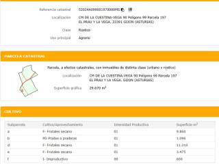 Excelente oportunidad de adquirir en propiedad esta finca rústica ubicada en la localidad de Gijón, provincia de Asturias. Dispone de buenos accesos y está bien comunicada. Se ofertan varias parcelas en la zona conocida cómo parroquia de de Bernueces. Las parcelas se encuentran valladas y fuera de explotación. No se aprecian caminos interiores y su lindero más largo comunica con otras parcelas. Se trata de una finca sin aprovechamiento agrícola en la que se observa pasto y en alguna ganado. No se aprecian instalaciones de riego. Referencia catastral: 52024A099001970000MS.El vendedor es titular, únicamente, de una cuota indivisa de la propiedad del Inmueble; no es titular del 100% del pleno dominio, el resto de los propietarios tiene derecho a la adquisición preferente sobre su participación indivisa. El inmueble se transmite a cuerpo cierto.