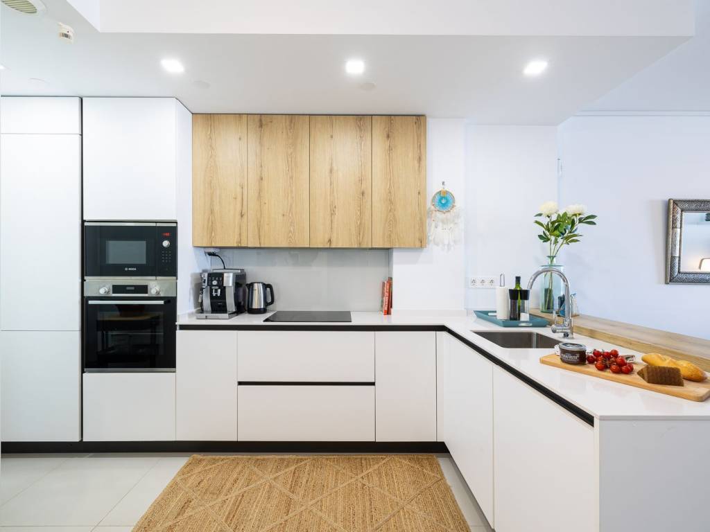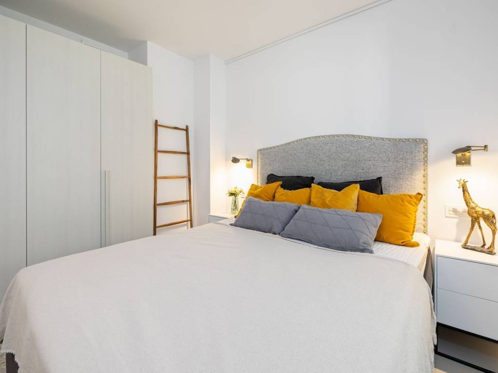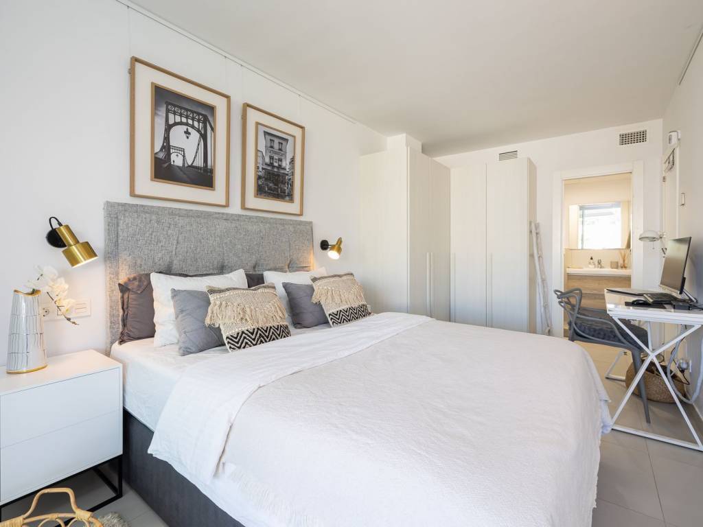 The apartment has two spacious bedrooms and two bathrooms. The open kitchen is equipped with high quality appliances and furniture. The living room and master bedroom both open up to the big glassed terrace area. The property has a heating and cooling system and you can control the temperature with the AirZone system in each room. Individual solar panels are now being installed on the community roof making this property yet more energy efficient. There is also a domotic home management system that includes, for example water leak detector and fire alarm. All fixtures and fittings are of high quality. The floor tiles are from Saloni and kitchen appliances from Bosh.