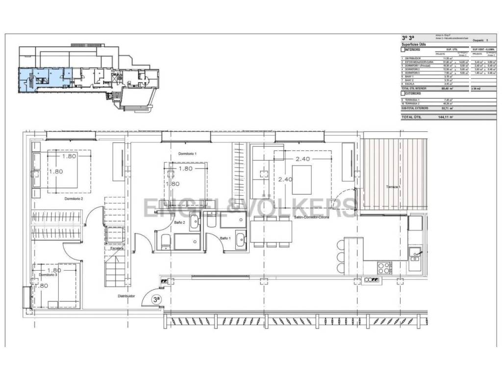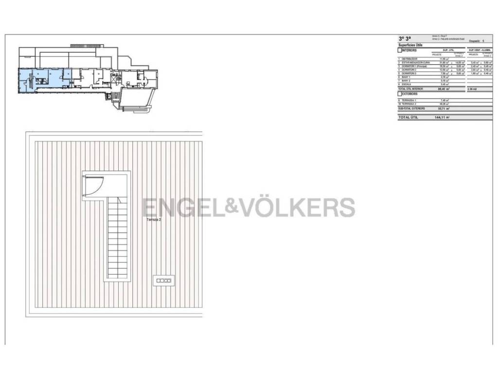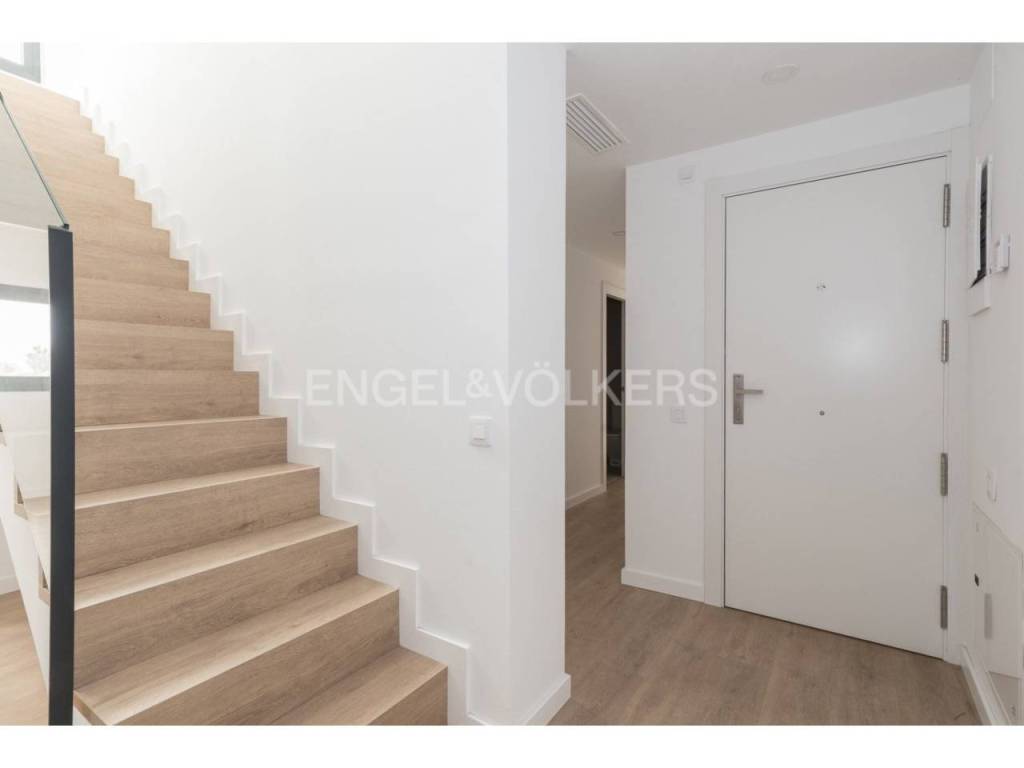 Al entrar a la vivienda, un distribuidor nos lleva al salón comedor con una cocina semi integrada y una terraza soleada de 8m². En la zona de noche hay tres habitaciones, y dos baños. Las habitaciones son dos dobles, una de ellas con baño en suite y la otra individual. A través de unas escaleras accedemos a la planta de arriba con una terraza de 49 m² aprox.