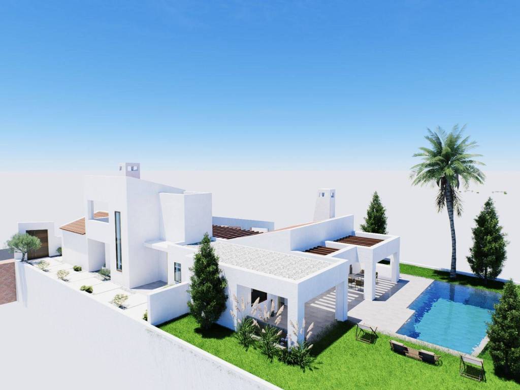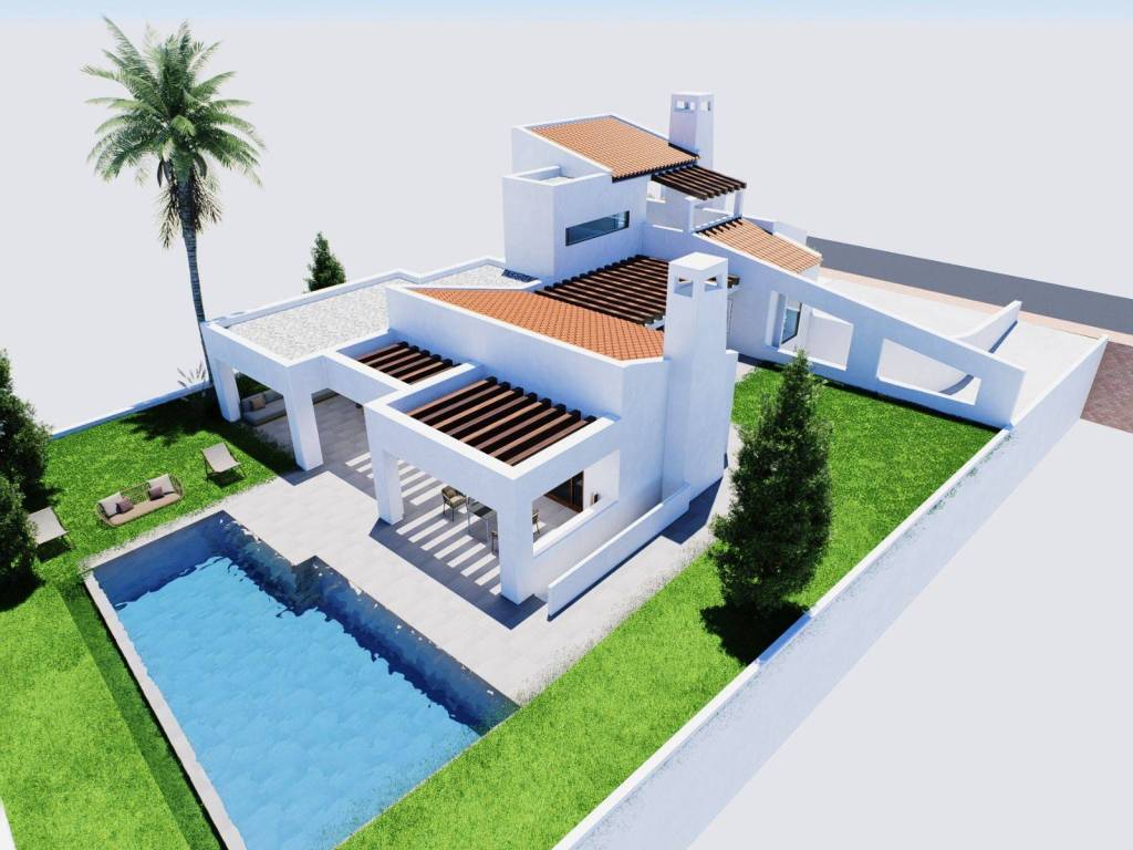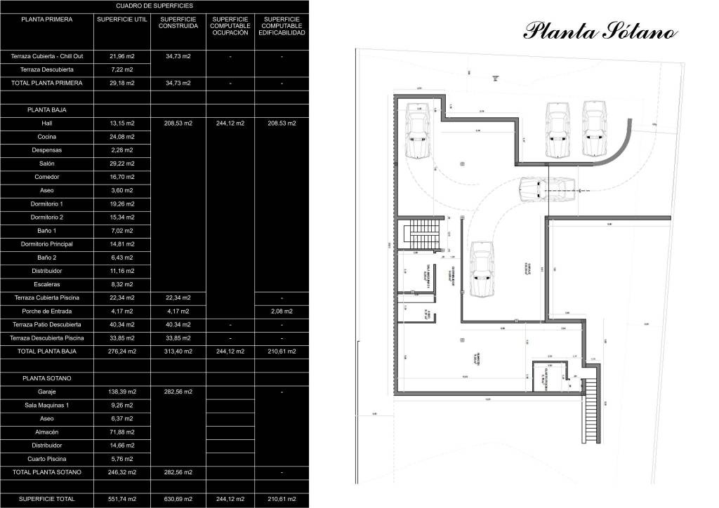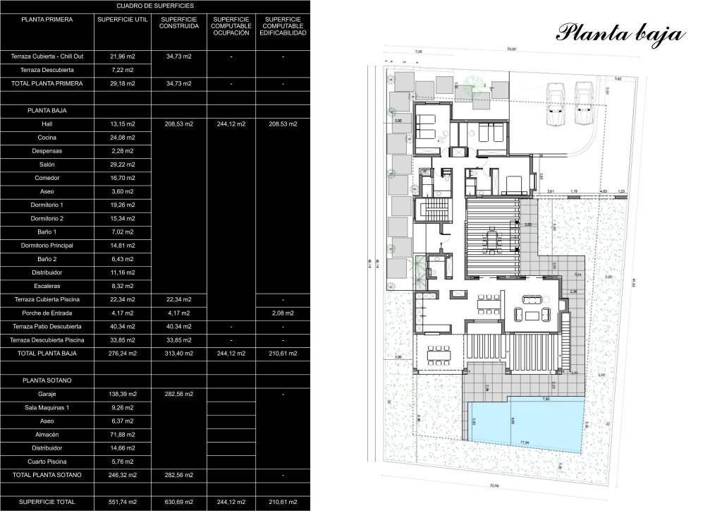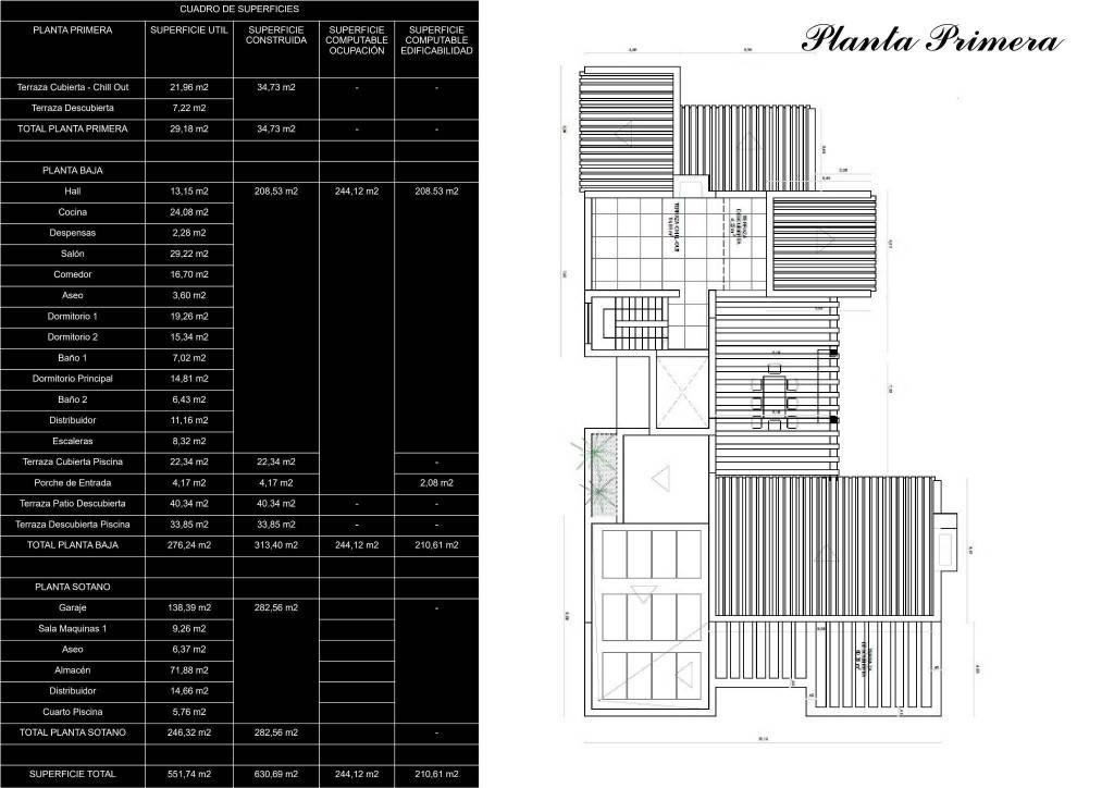 Dos terrazas cubiertas por pérgolas de hormigón: una interior de 40,34 m² y otra junto a la piscina de 60,36 m².