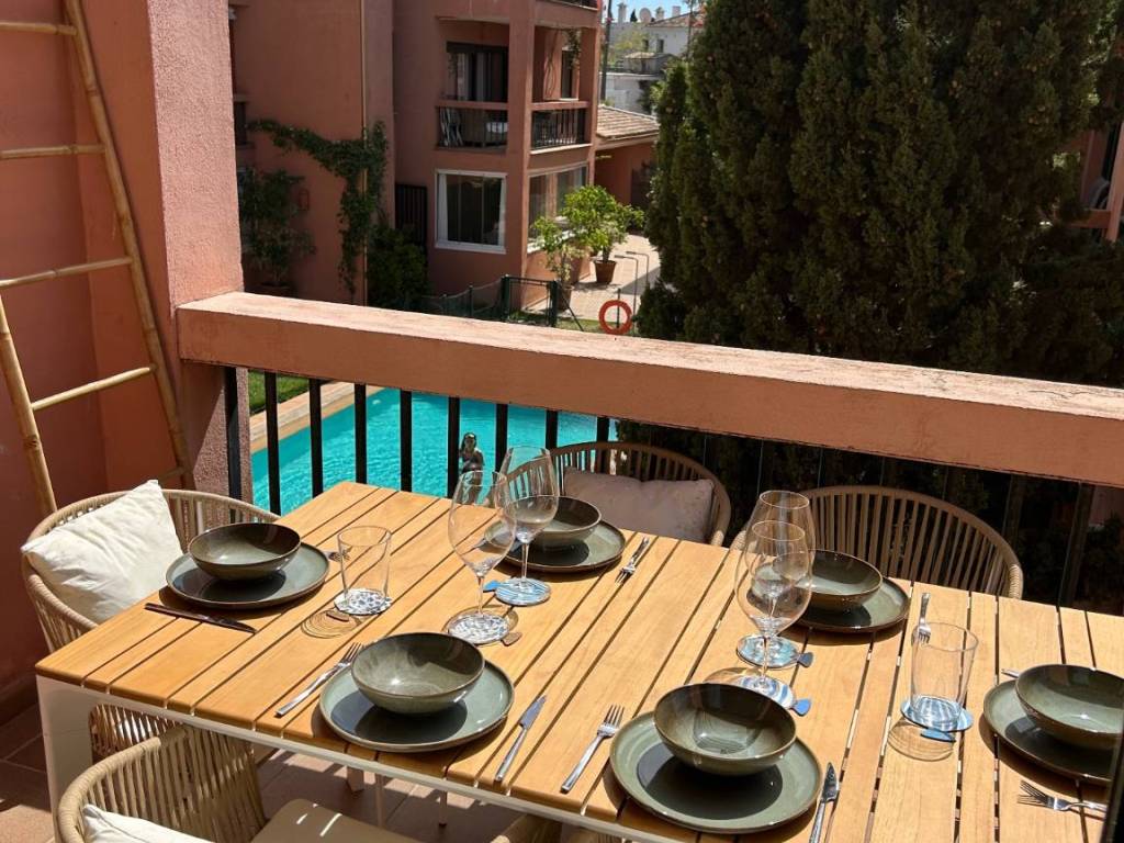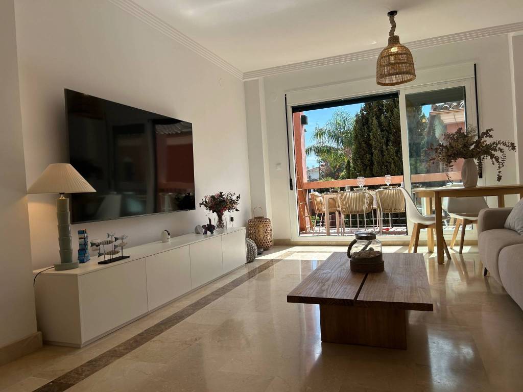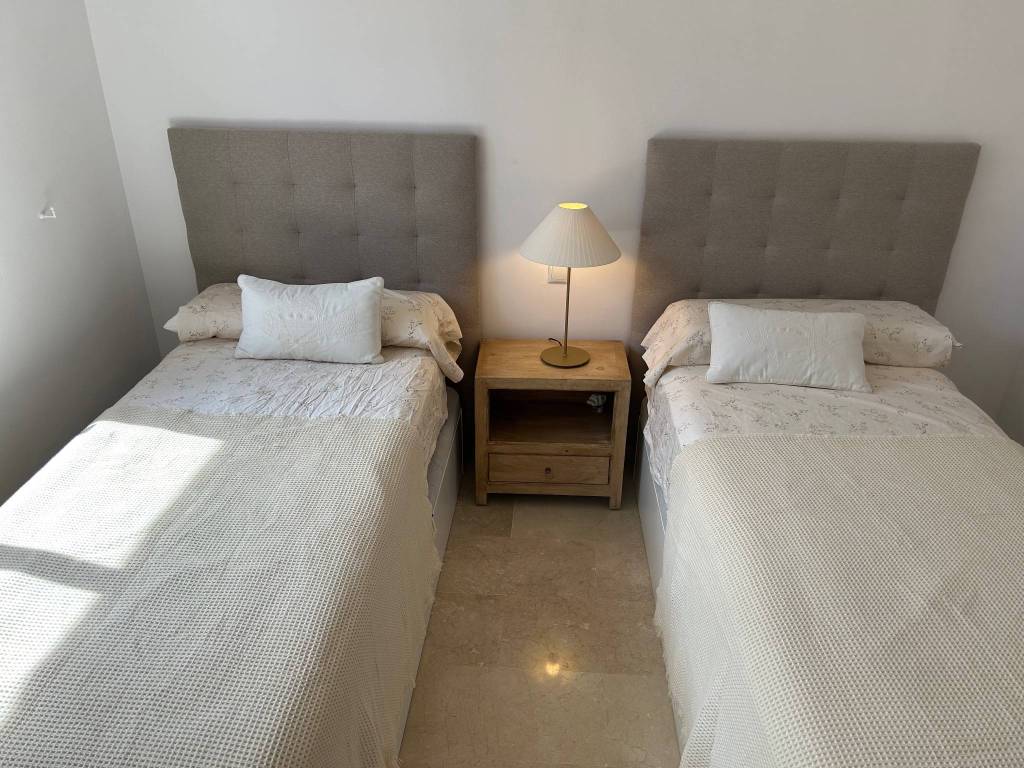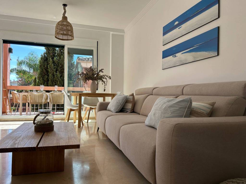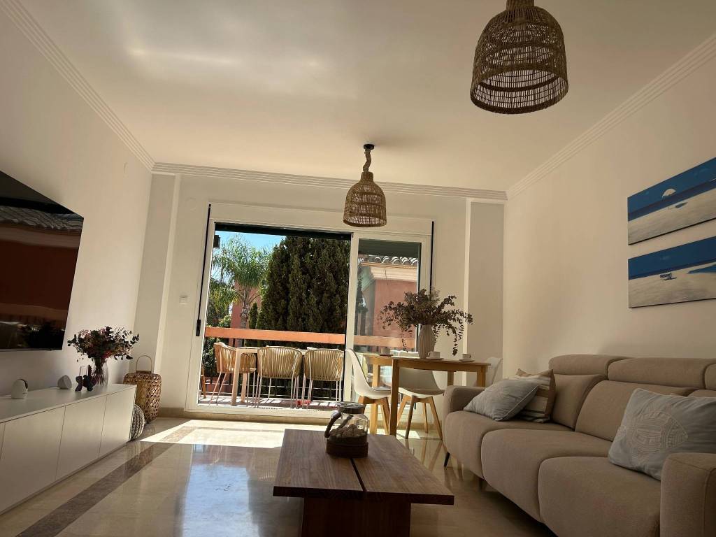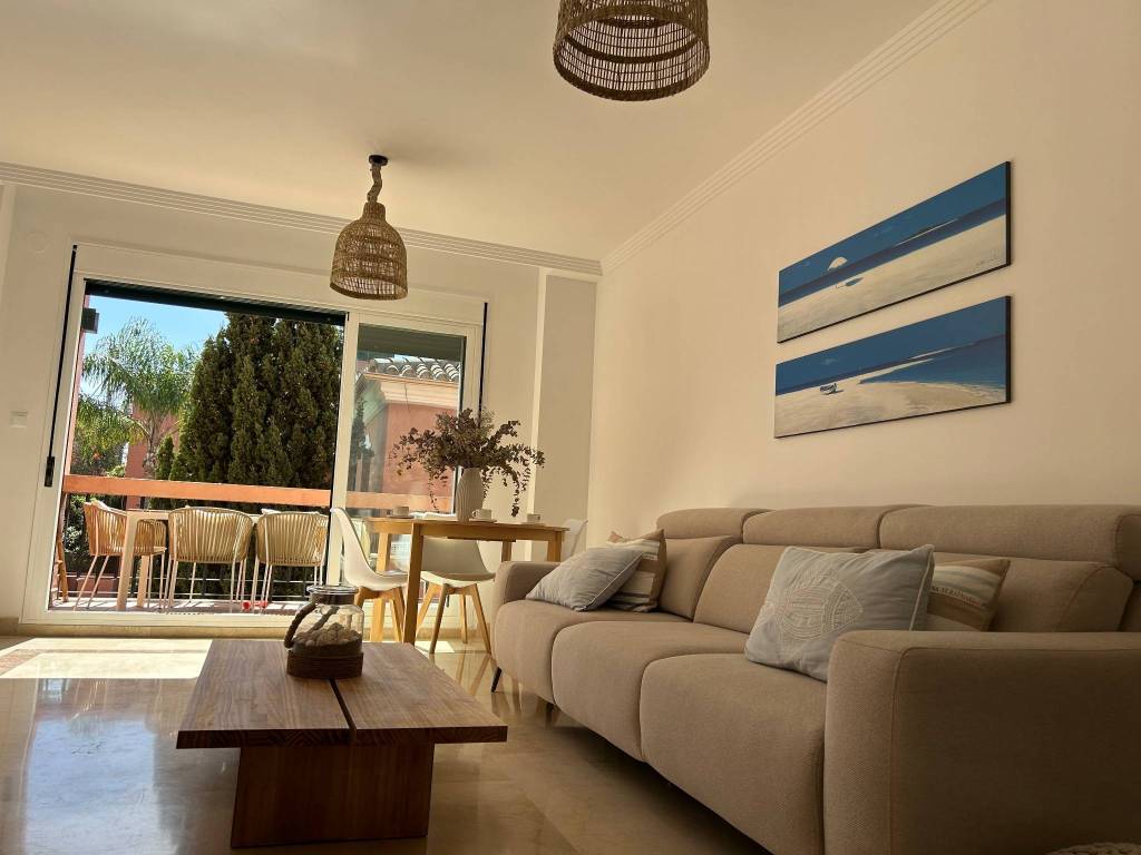 Dos dormitorios, con una preciosa terraza privada, cocina, cuarto de servicio y tendedero cubierto, dos baños completos, en el complejo carib playa, situado a 300m de la playa, junto a las dunas de artola y el puerto de cabopino.