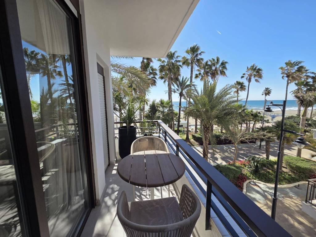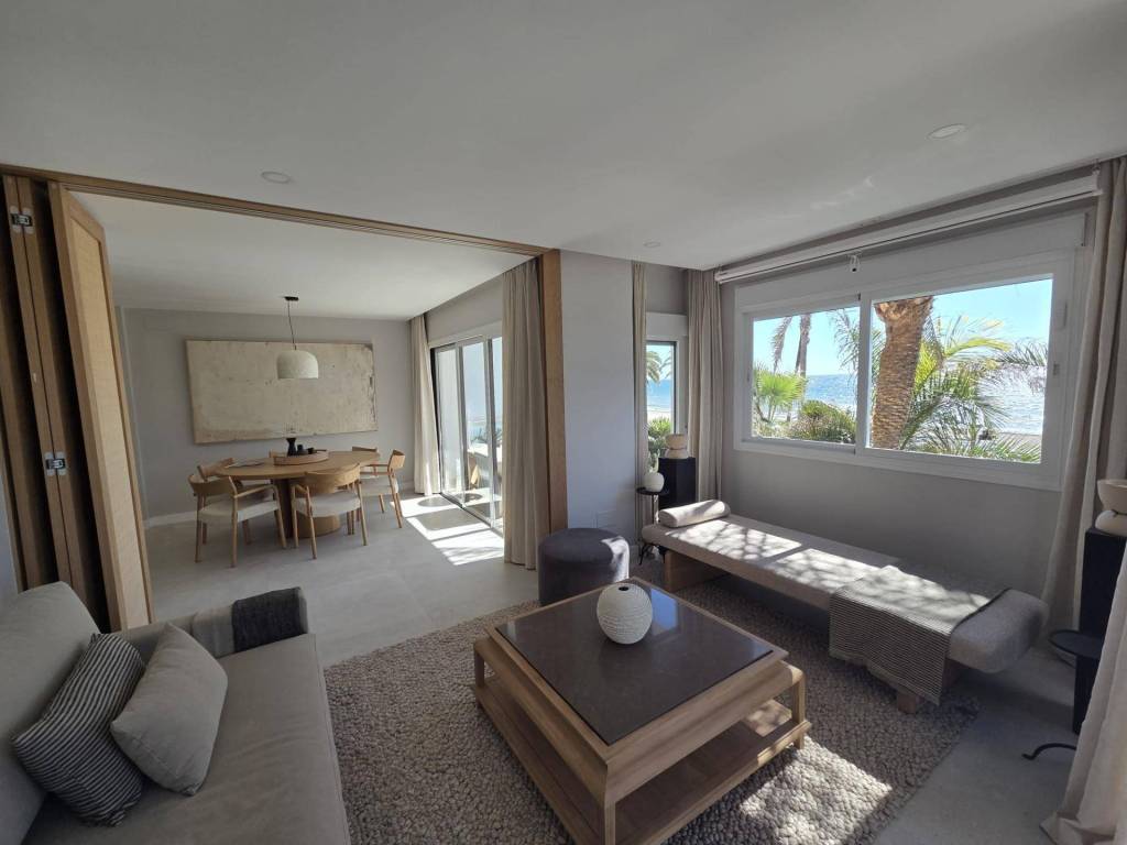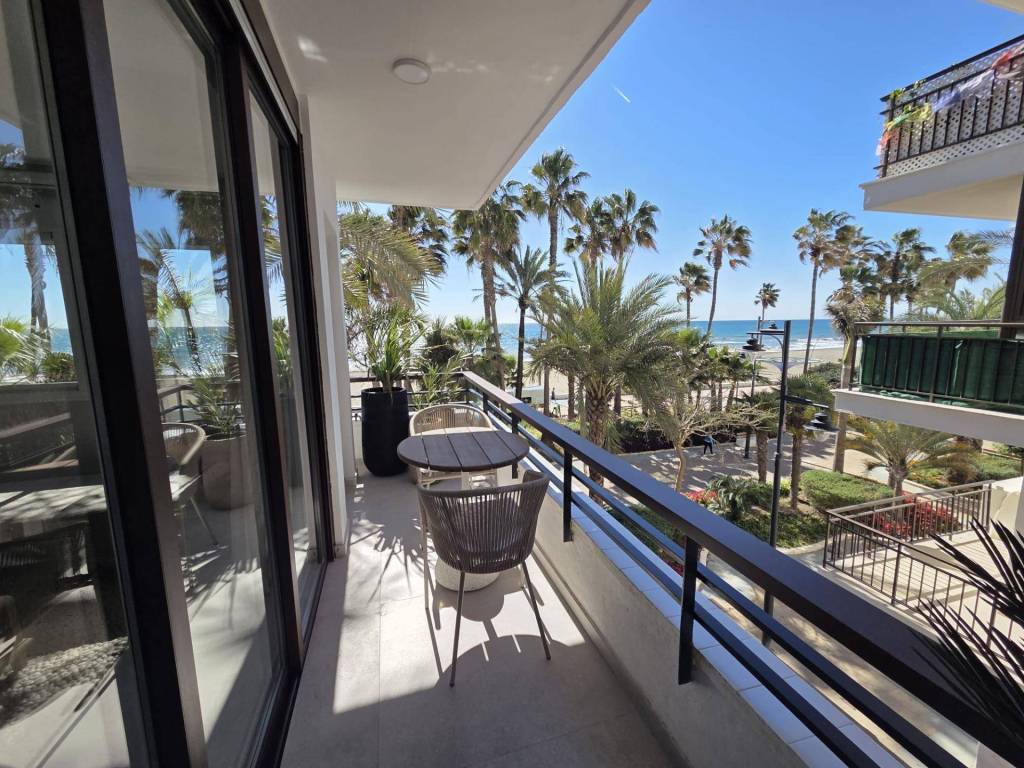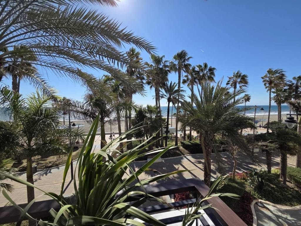 Seafront apartment for sale in Estepona, located on the prestigious Avenida España, right on the first line of the beach. This stunning property offers spectacular panoramic sea views and will be delivered fully renovated, featuring a brand-new, fully equipped kitchen. The apartment includes 2 bright bedrooms, 2 modern bathrooms, a spacious living-dining area, and a large terrace facing the Mediterranean, perfect for enjoying sunrises and sunsets over the sea.Its prime location, just steps from the promenade and a short walk from Esteponas charming Old Town, makes it an ideal home or a high-return investment opportunity on the Costa del Sol.Completion scheduled for the end of December.A truly unique beachfront property in the heart of Estepona.