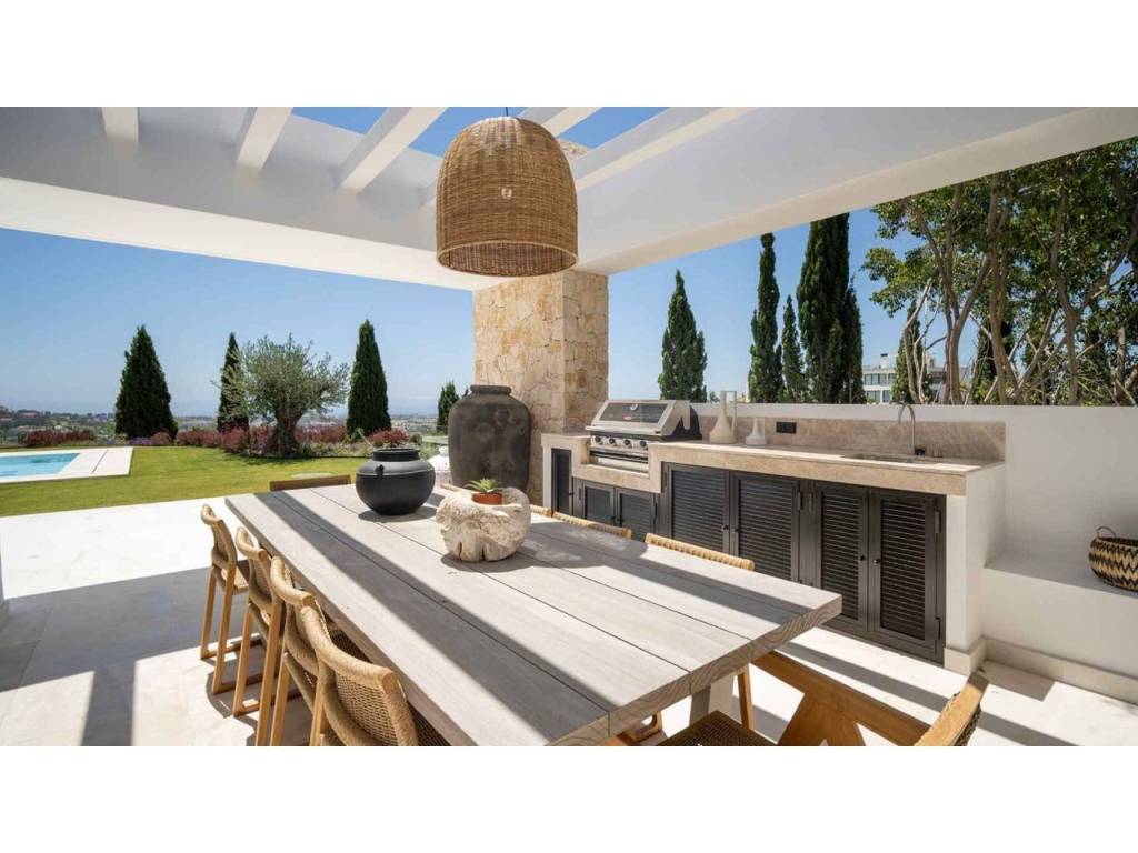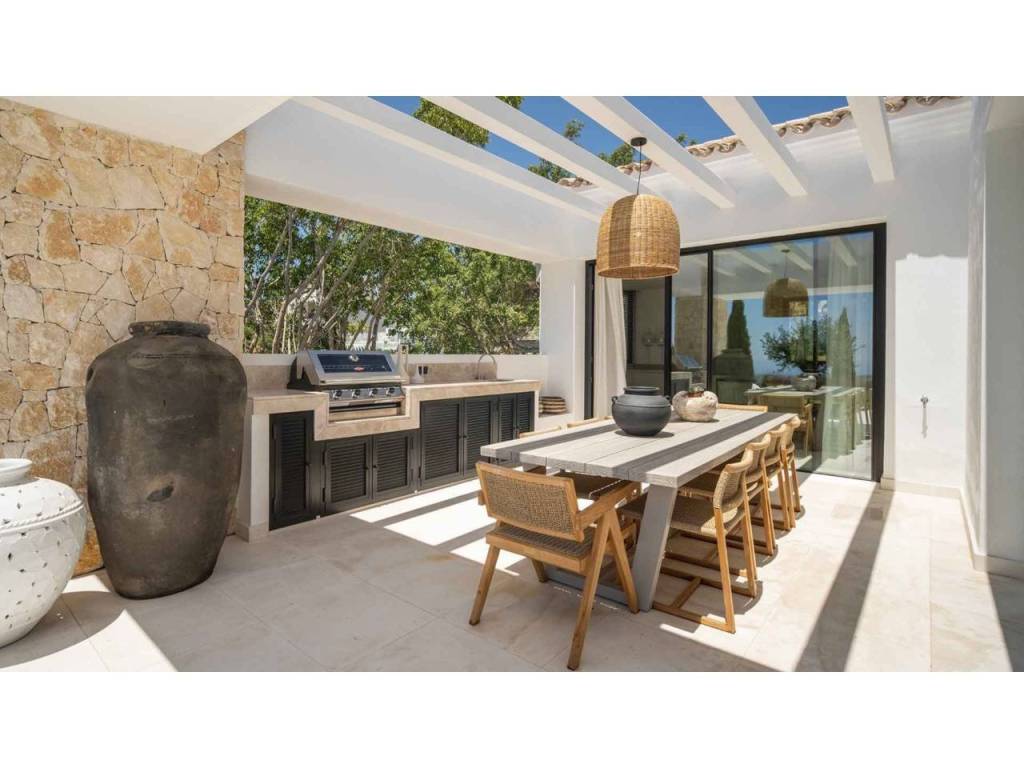 L''extérieur de la villa est vraiment spectaculaire. Elle dispose d''un vaste jardin méticuleusement entretenu, d''une piscine de rêve, de plusieurs zones de détente et d''une salle à manger extérieure avec barbecue, idéale pour profiter du beau temps et des vues panoramiques sur la mer à couper le souffle.