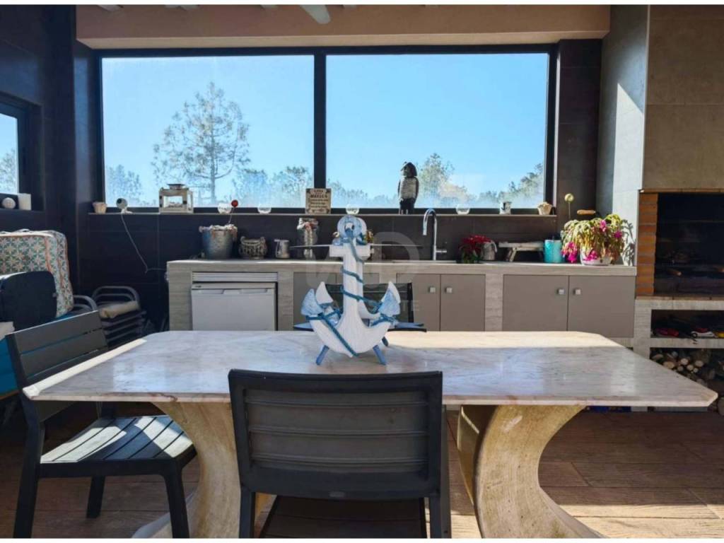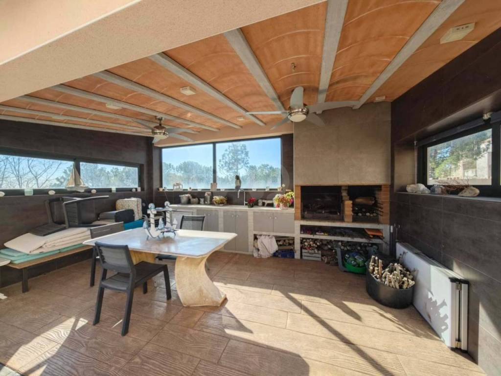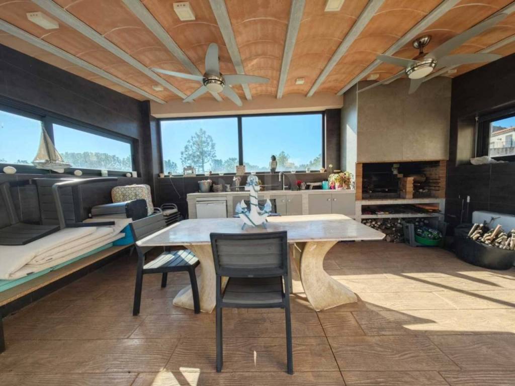 Zona de barbacoa cubierta, con barbacoa doble, tipo argentina, fregadero, nevera, espacio para comer y zona sofá