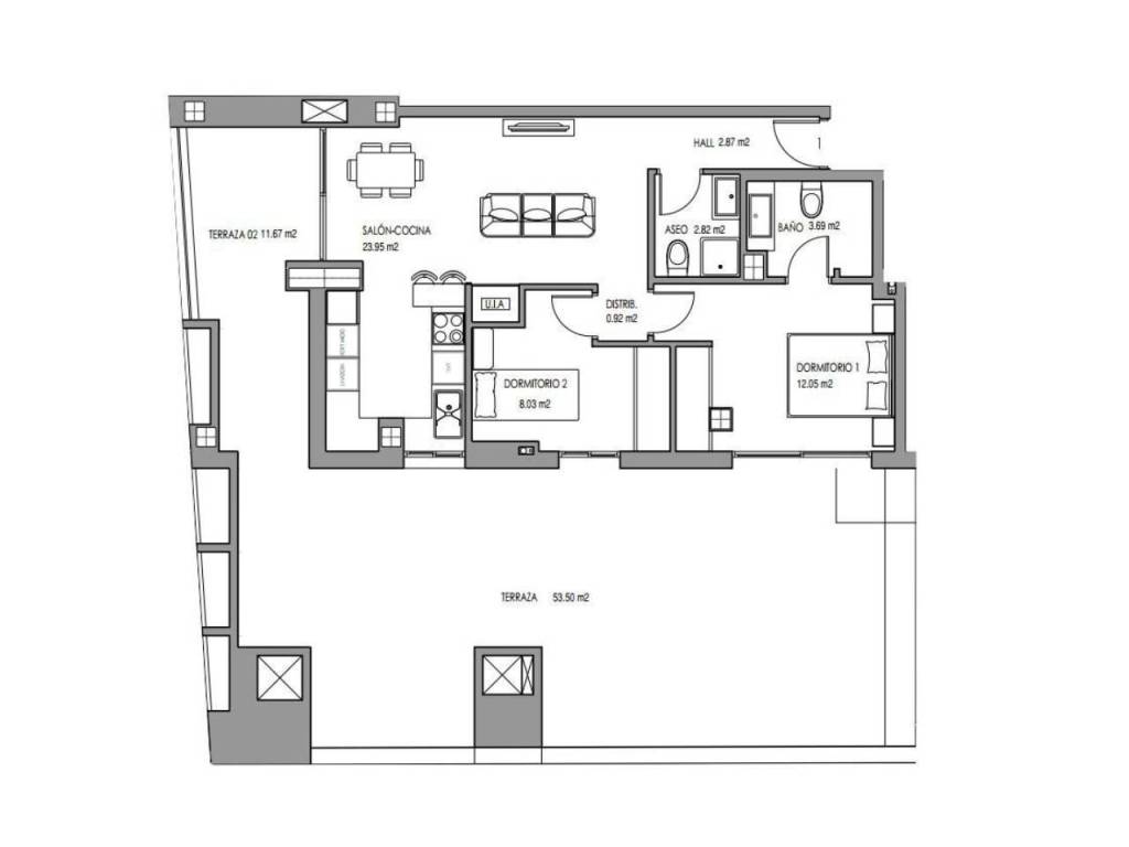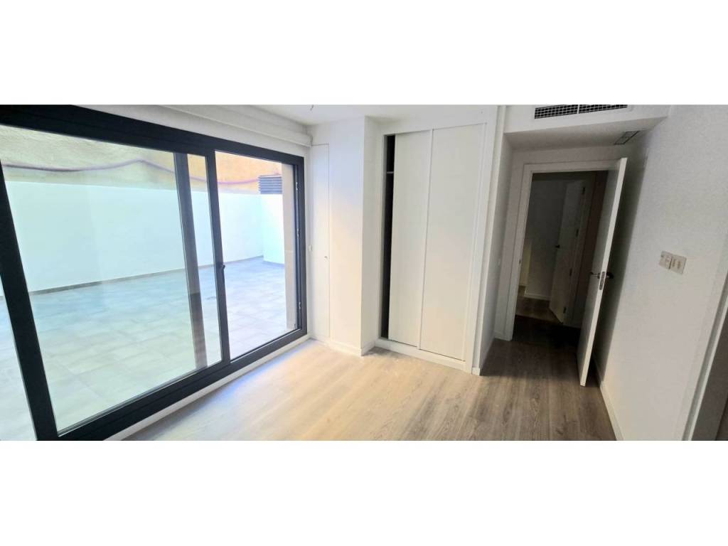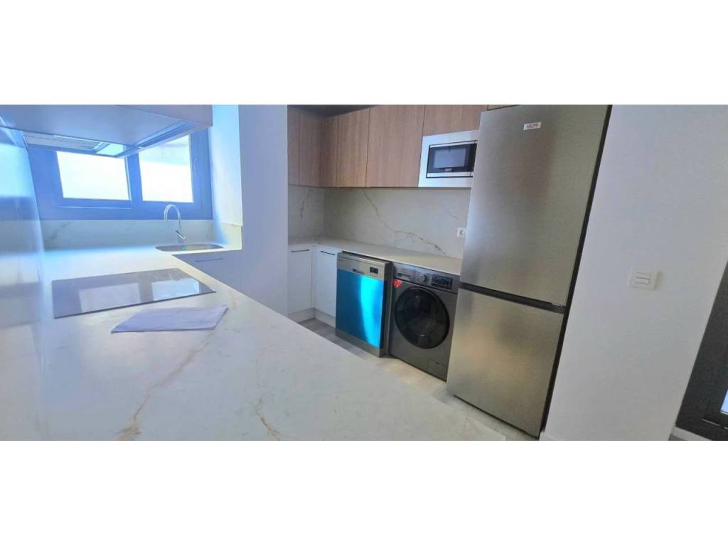 Por este precio le ofrecemos un piso en planta baja, con 2 habitaciones, cocina completamente amueblada y equipada con electrodomésticos de eficiencia energética, amplio salón-comedor con termostato ambiente, 2 cuartos de baño, uno de ellos en suite con el dormitorio principal y una gran terraza de 65`17 m² que rodea la vivienda.