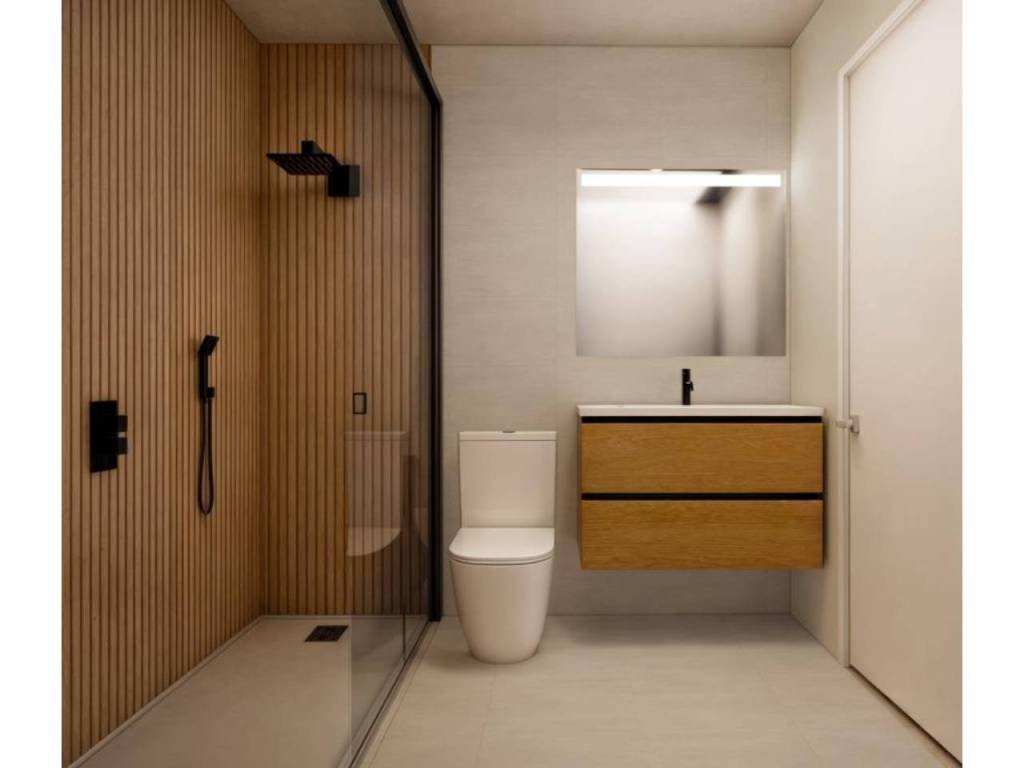 Fully fitted bathrooms with vanity unit, mirror, shower screen, and toilet