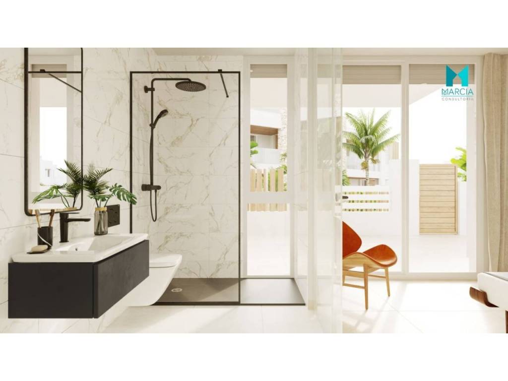 Lavabo encastrado en mueble suspendido con espejo incluido. Grifería monobloc de color negro mate con válvula automática. Ducha efecto rain. Plato de ducha extraplano de resina blanco, o grafito con cristal fijo o mampara. Inodoro suspendido. Suelo radiante en baños con termostato digital.