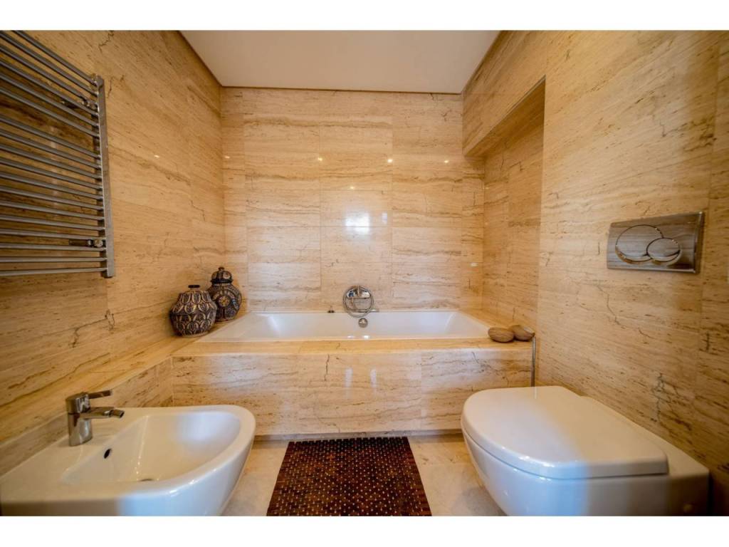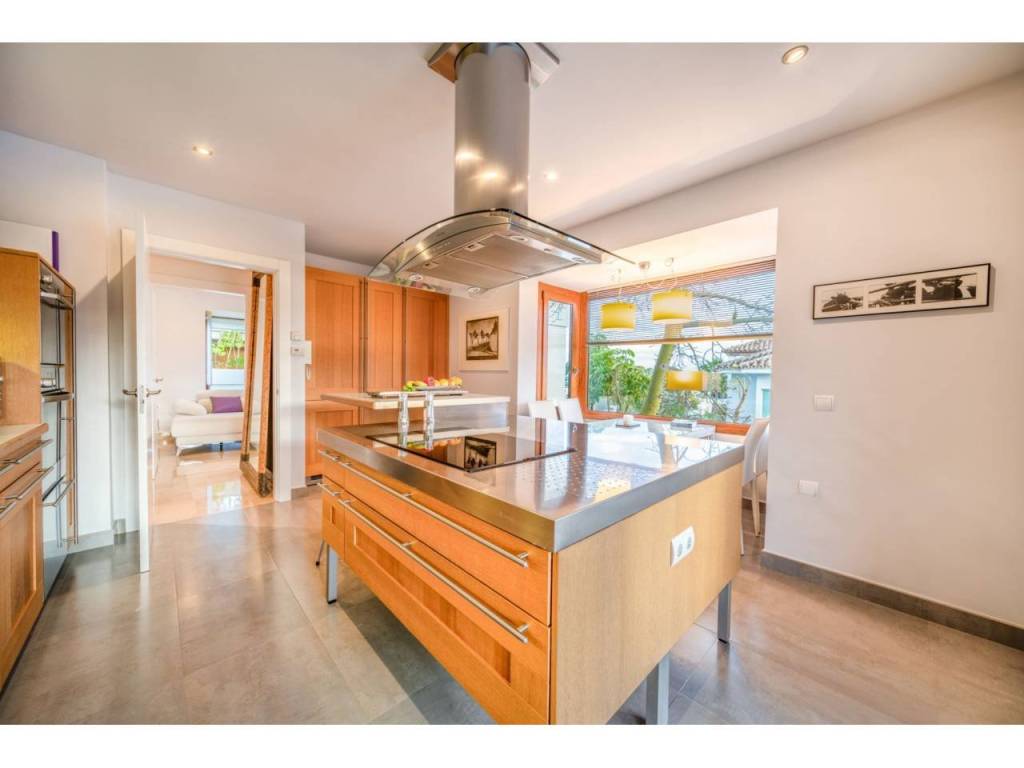 Arranged over three levels, the villa opens at the entrance level into a generous, light-filled living area with a fireplace, access to both covered and uncovered terraces and an established garden, alongside a fully fitted kitchen with a cooking island and direct outdoor access. A bedroom and bathroom on this level offer flexible accommodation for guests or family, while a second sitting room provides additional space that could serve as a further bedroom or a quiet retreat.